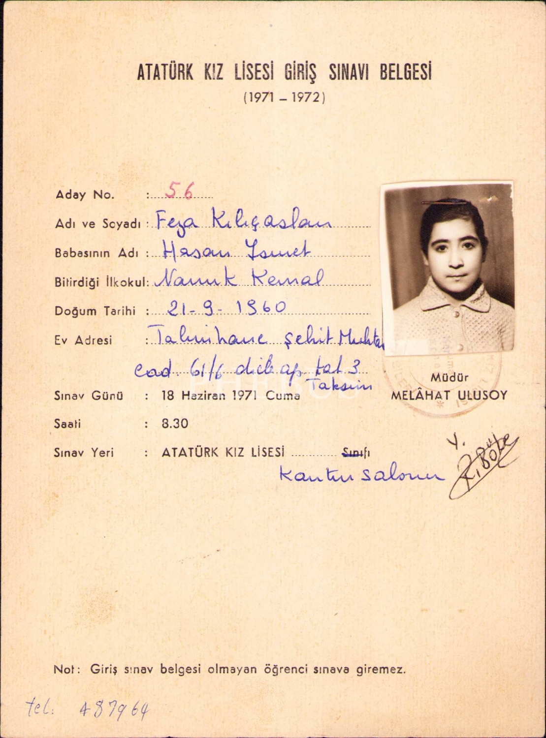 Atatürk Kız Lisesi fotoğraflı giriş sınavı belgesi, 1971, 15x21 cm