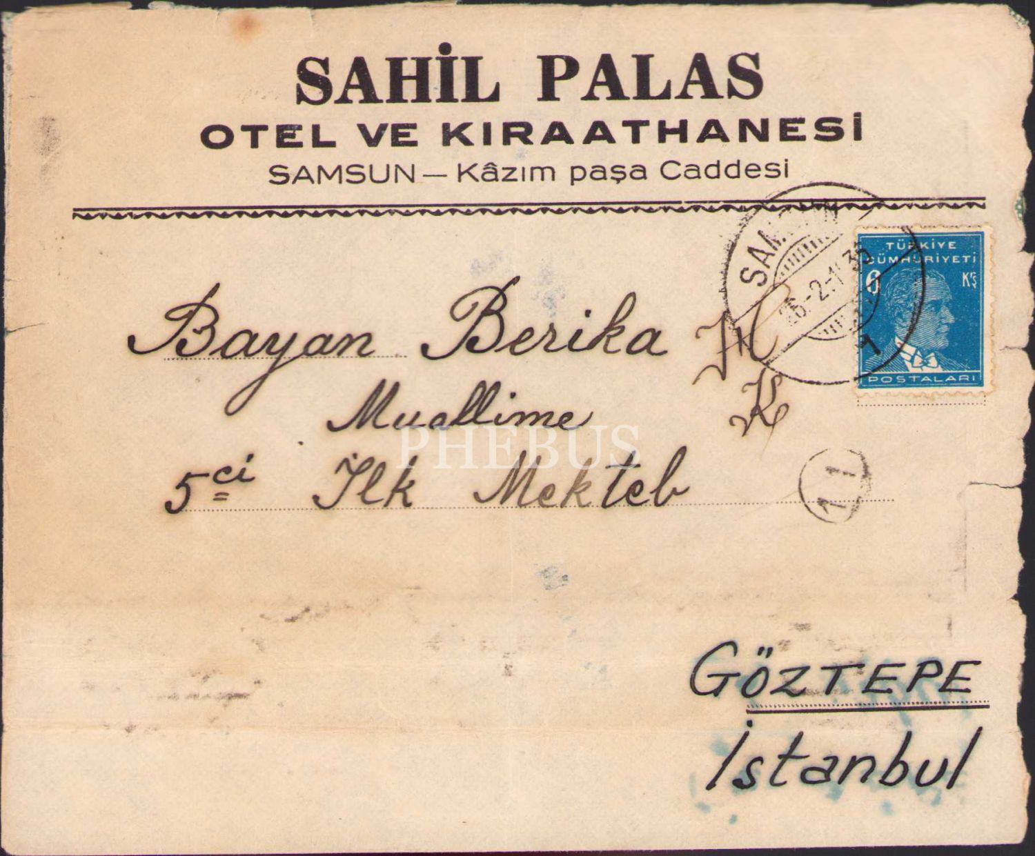 Sahil Palas Otel ve Kıraathanesi antetli zarf, pullu ve mühürlü, 12x15 cm, yıpranmış haliyle
