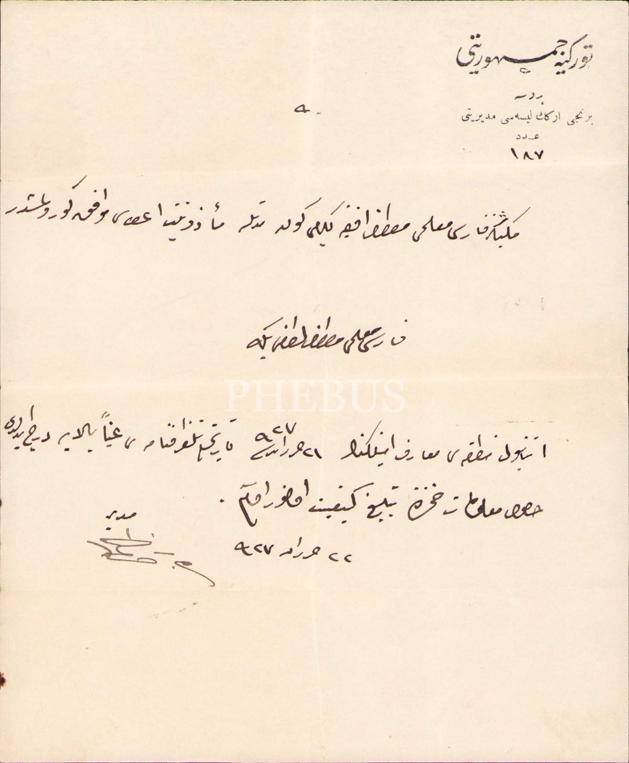 Osmanlıca Türkiye Cumhuriyeti Bursa Erkek Lisesi Müdürlüğü antetli evrak, 1927 tarihli, 17x20 cm