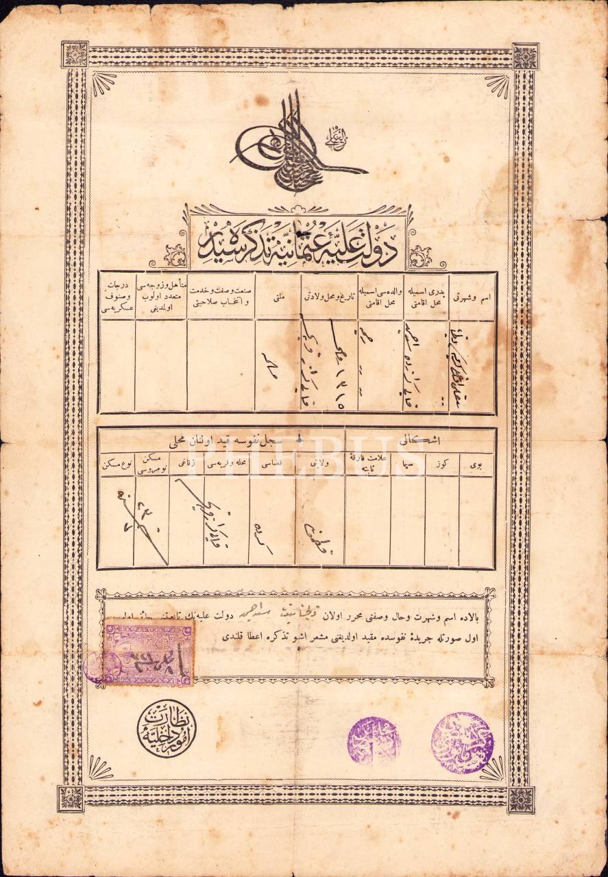 Osmanlıca nüfus tezkiresi, 1321 tarihli, 24x35 cm, yıpranmış haliyle
