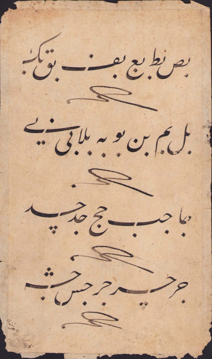 Hoca işi talik hurufat meşki, sol altta M. Tahir Efendi notu var, 10x20cm