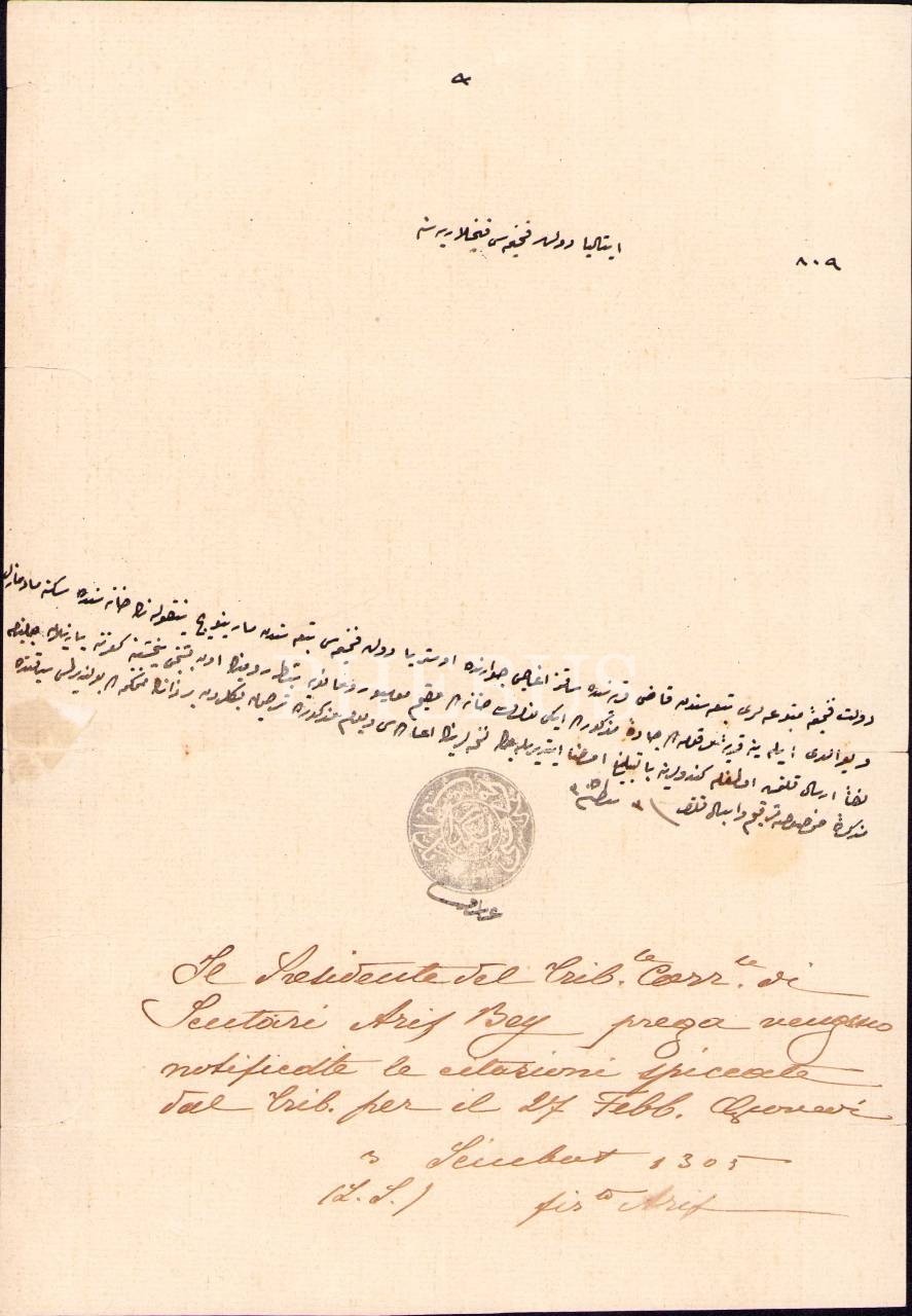 Üsküdar Merkez Bidayet Mahkemesi kabartma antetli Osmanlıca-İtalyanca evrak, 1305 tarihli, 20x29 cm, kenarları yırtık haliyle