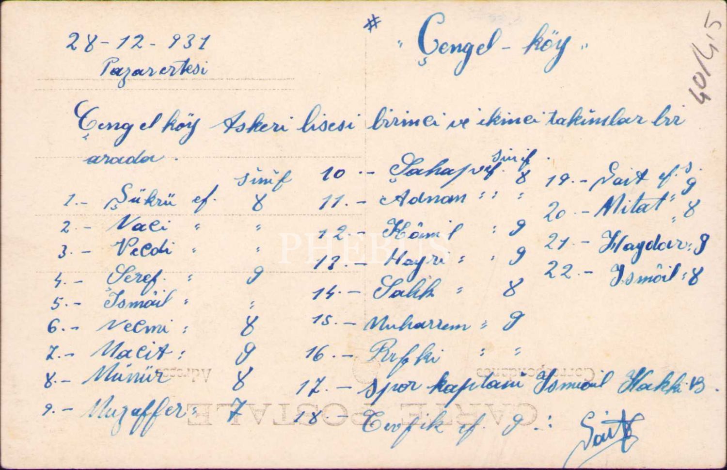 Çengelköy Askerî Lisesi futbol takımı hatıra fotoğrafı, 1931, arkası yazılı