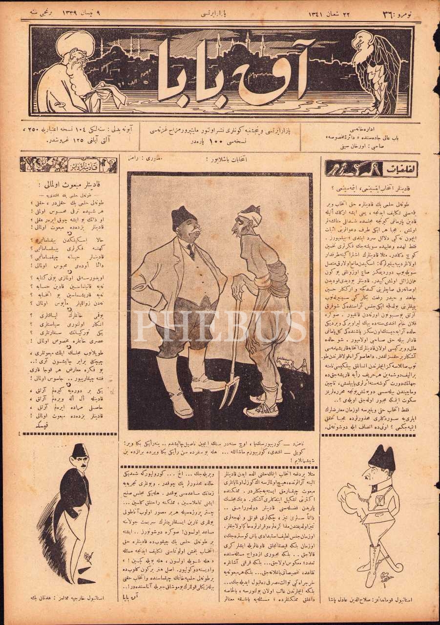 "Namzed: Görüyorsun ya, üç senedir senin için nasıl çalışdım.. Yine reyini bana ver! Köylü: Efendi, görüyorum maşallah… Hele bu sefer de sen reyini bana ver de biraz da ben şişmanlayım!" *Türkiye'nin en uzun ömürlü mizah dergilerinden olan Akbaba, 1922 yılında Yusuf Ziya Ortaç ve Orhan Seyfi Orhon tarafından kurulmuş ve kesintilerle birlikte 1977'ye kadar yayın hayatını sürdürmüştür. Zaman içerisinde de toplumun yoksul kesiminin dergisi olarak geniş bir okuyucu kitlesine ulaşmıştır.