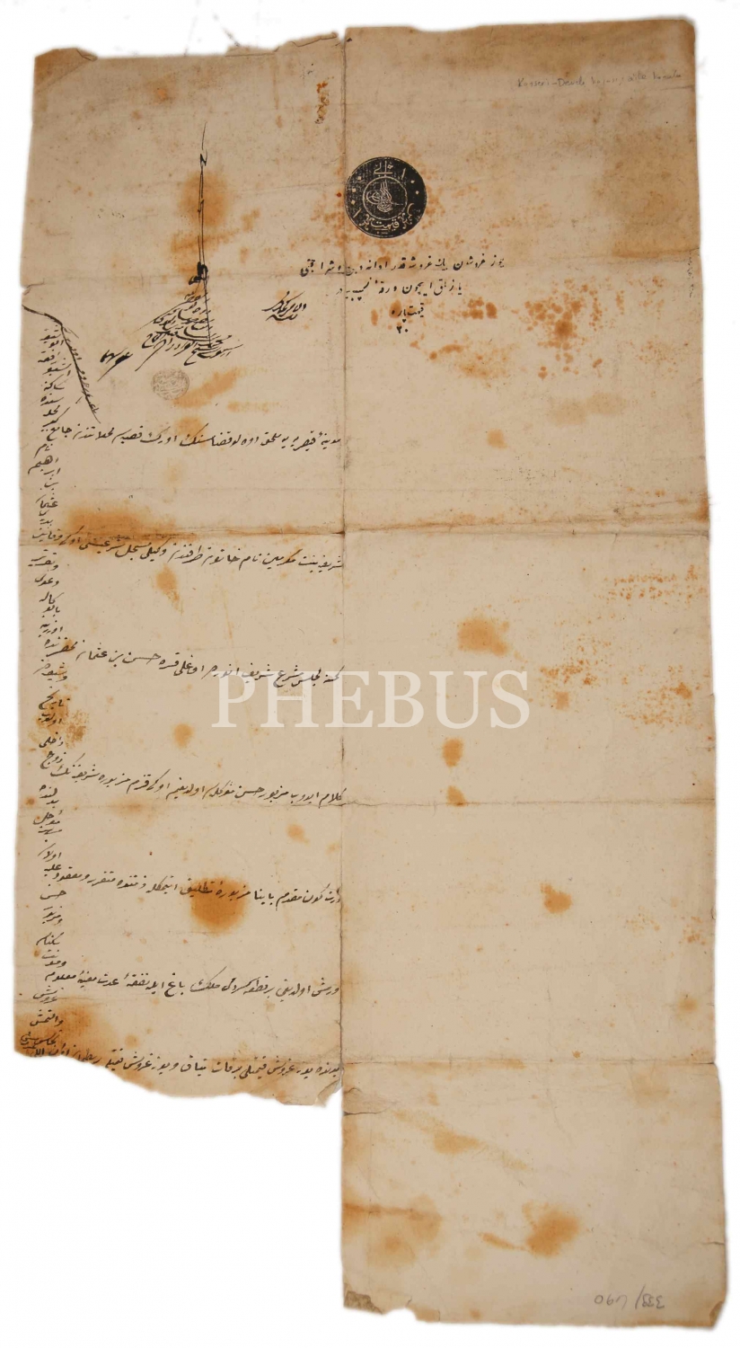 Osmanlıca hüccet, boşanma ve mihir konulu, Kayseri, 26x49 cm, yıpranmış ve tarihin yer aldığı alt kısım kopuk haliyle