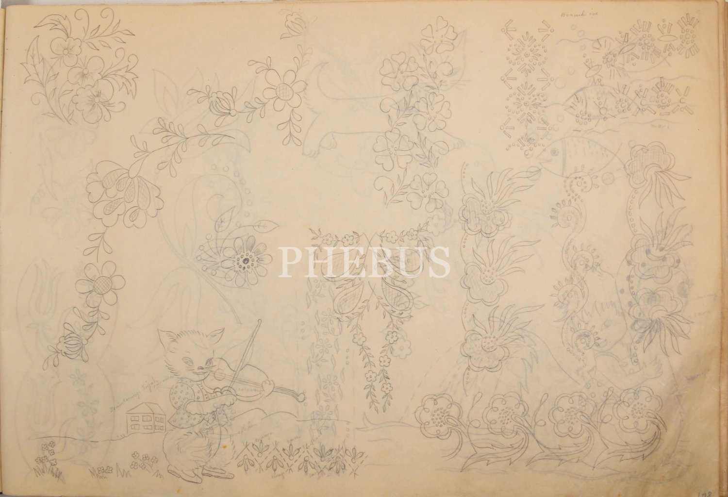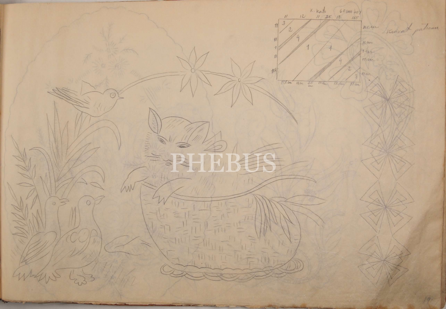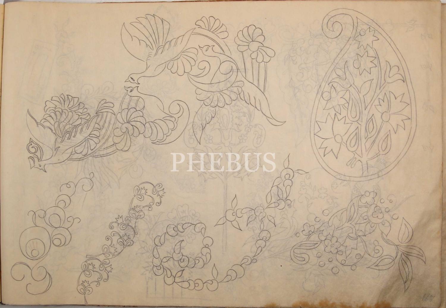 Büyük boy desen eskiz defteri, terzilik tarihi için önem arzeden bir çalışma olup 240 yapraklı defterin tamamı çizimlerle doludur. 33x49 cm, cildi yıpranmış haliyle