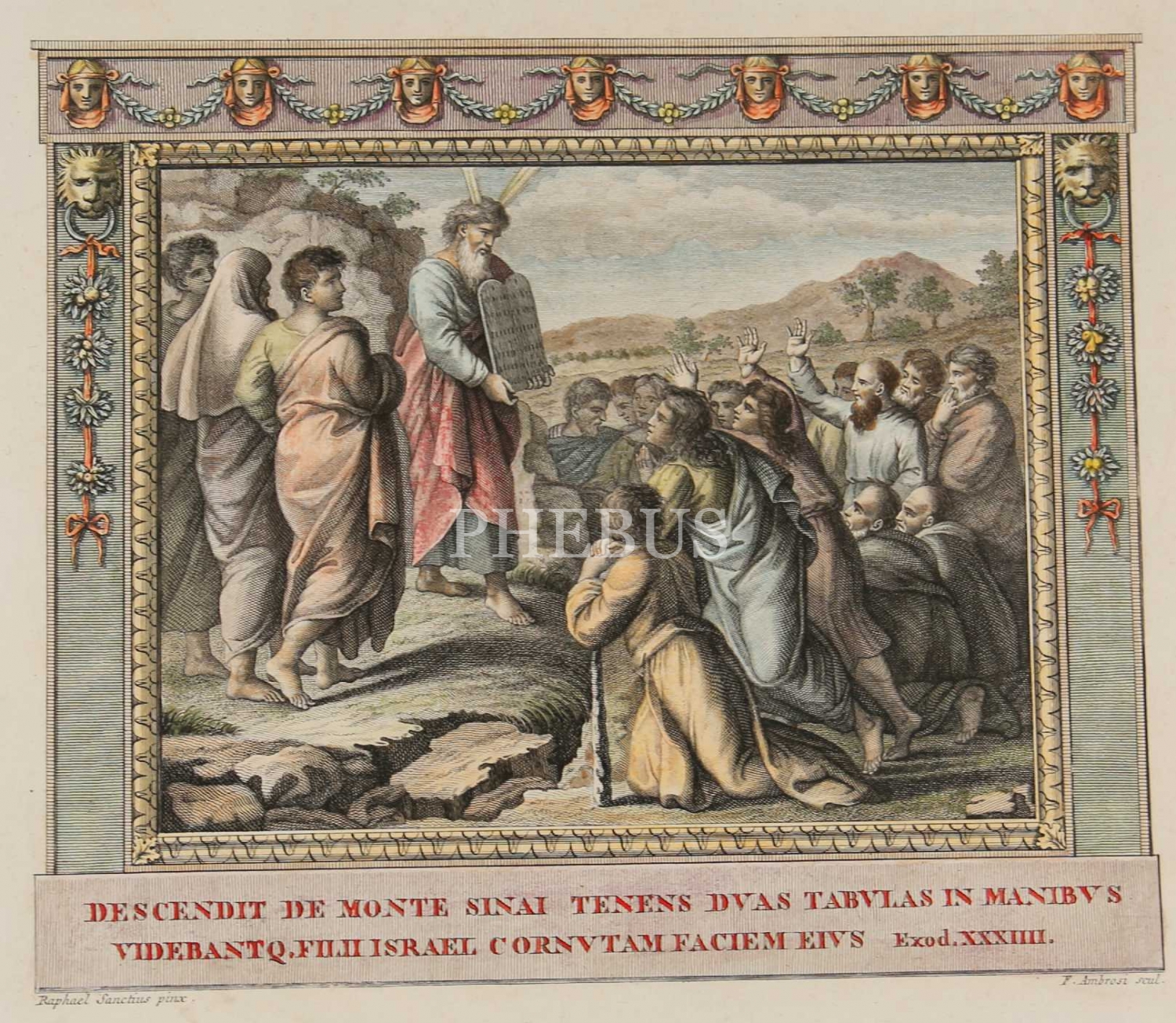 Hz. Musa'yı On Emir levhası ile gösteren renklendirilmiş gravür, 42x34 cm