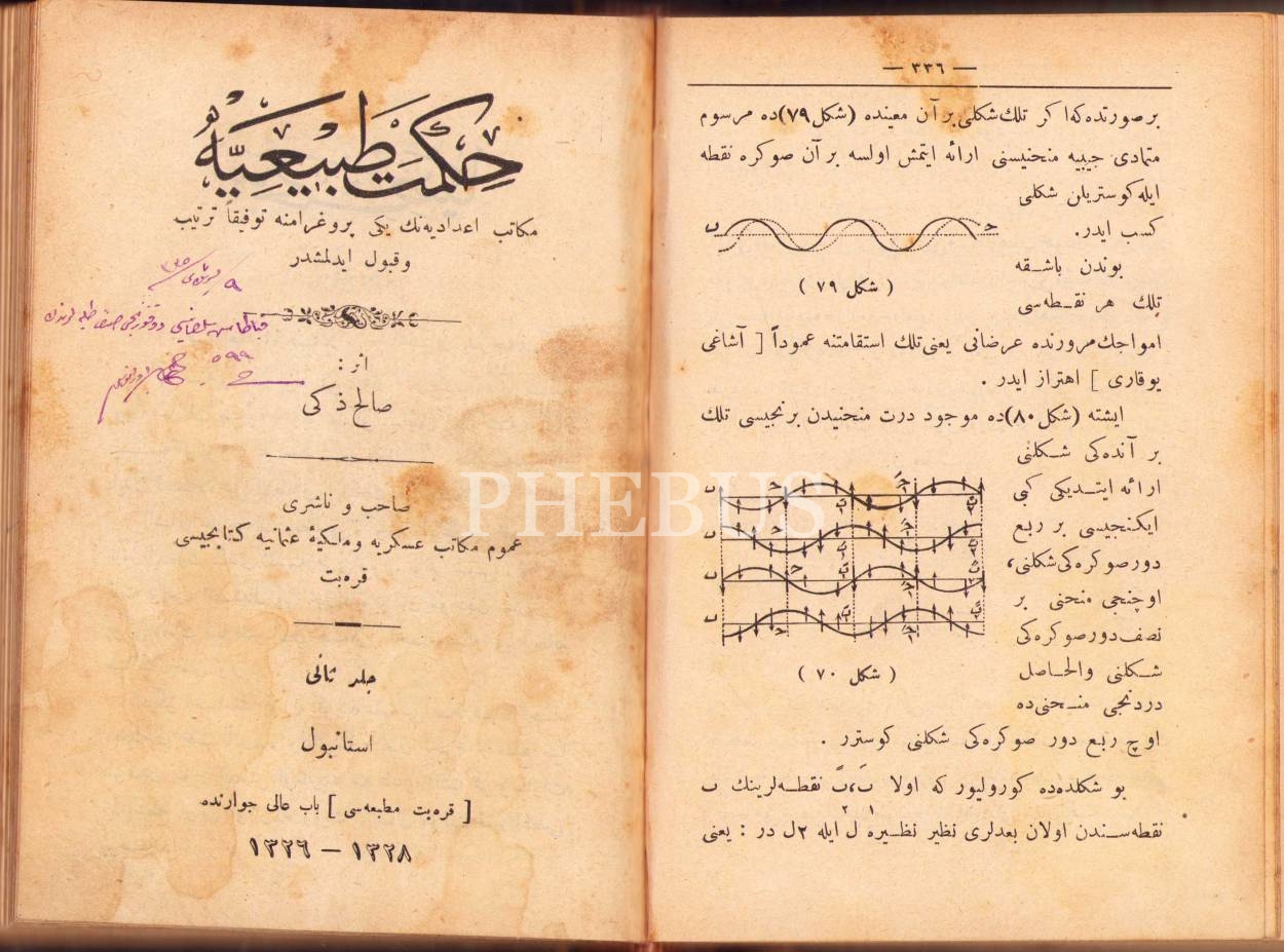 Osmanlıca Hikmet-i Tabîiyye [2 cilt], Salih Zeki, Karabet Matbaası, İstanbul 1326, 336+454 s., 12x18 cm,
