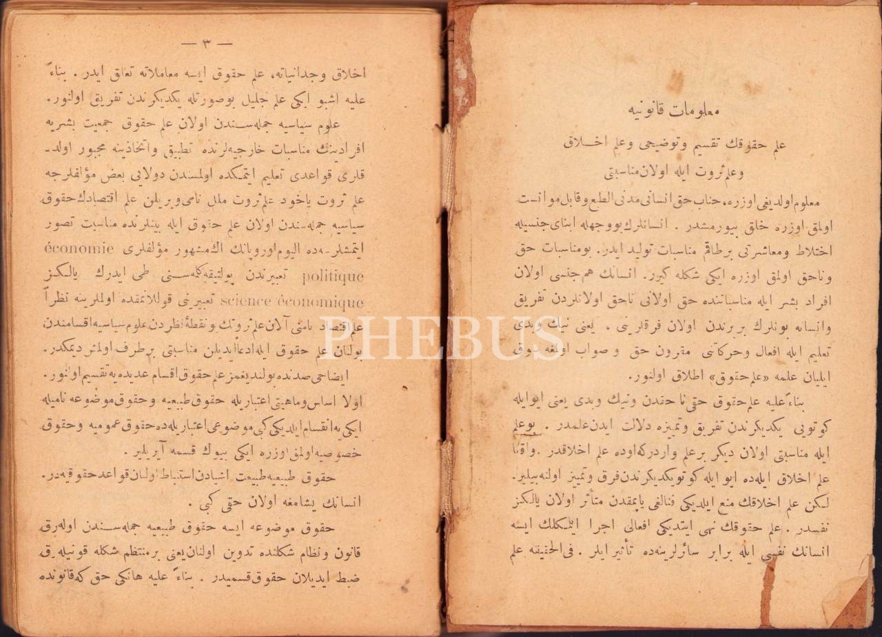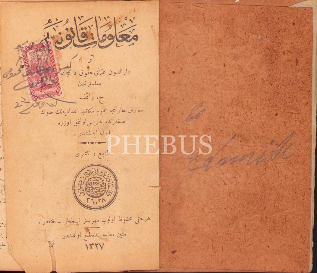 Osmanlıca Ma'lûmât-ı Kânûniyye [Yasal Bilgiler], H. Raif, Metin Matbaası, 1327, 334 s., 12x17 cm, cildi epey yıpranmış haliyle, ÖZEGE No: 12123