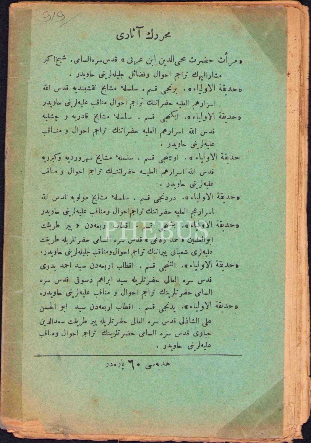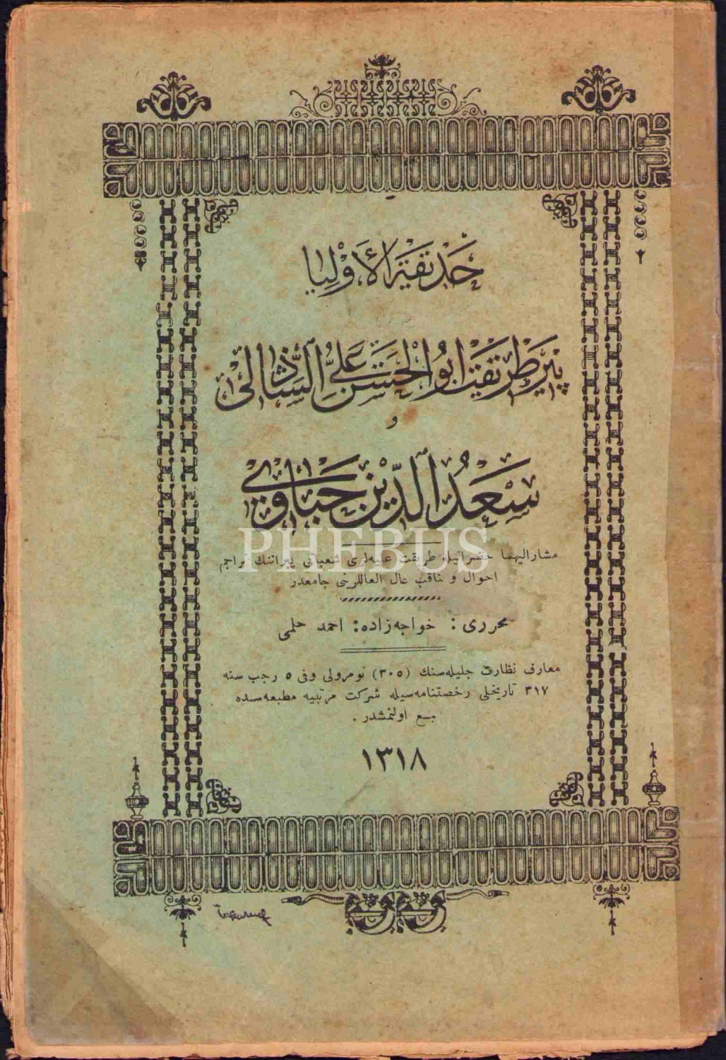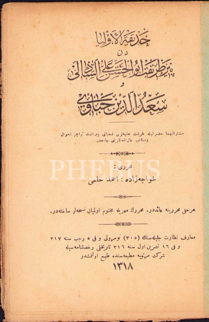 Osmanlıca Hadîkatu'l-Evliyâ, Hocazâde Ahmed Hilmi, Şirket-i Mürettibiye Matbaası, 1318, 62 s., 13x19 cm, ÖZEGE No: 6567