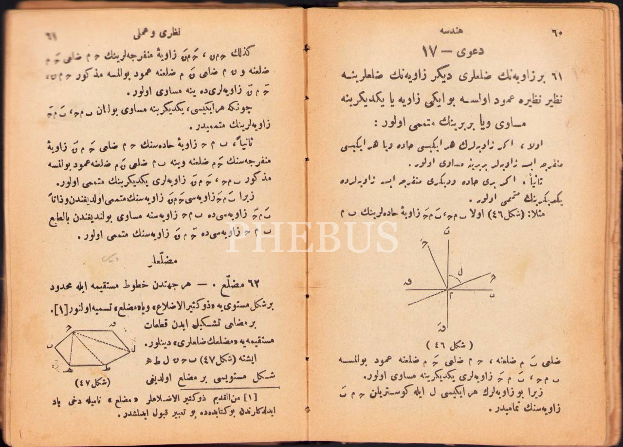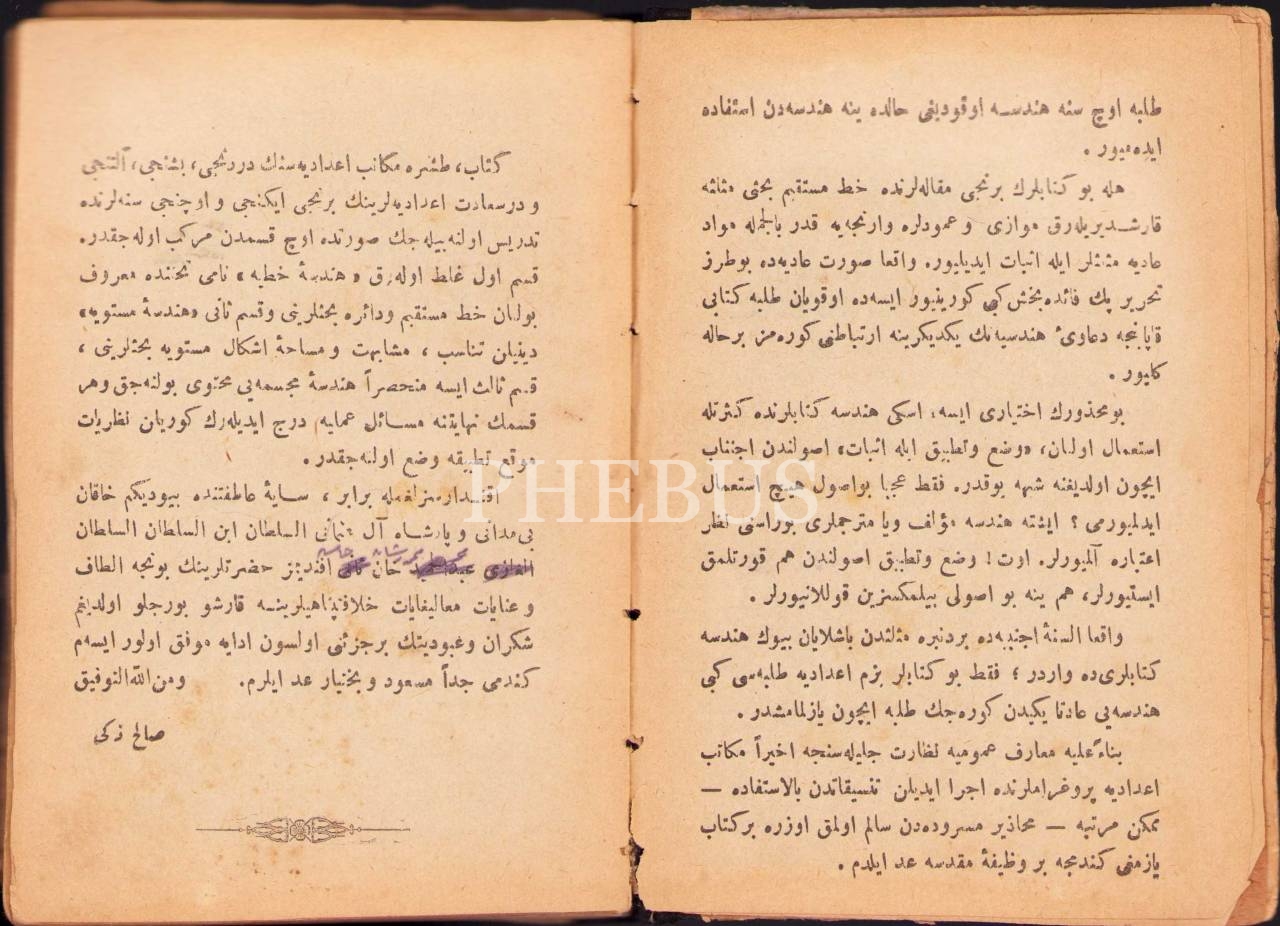 Osmanlıca Nazarî ve Amelî Hendese, Salih Zeki, Şirket-i Mürettibiye Matbaası, Dersaadet [İstanbul] 1322, 200 s., 12x17 cm, cildi yıpranmış haliyle, ÖZEGE No: 15211