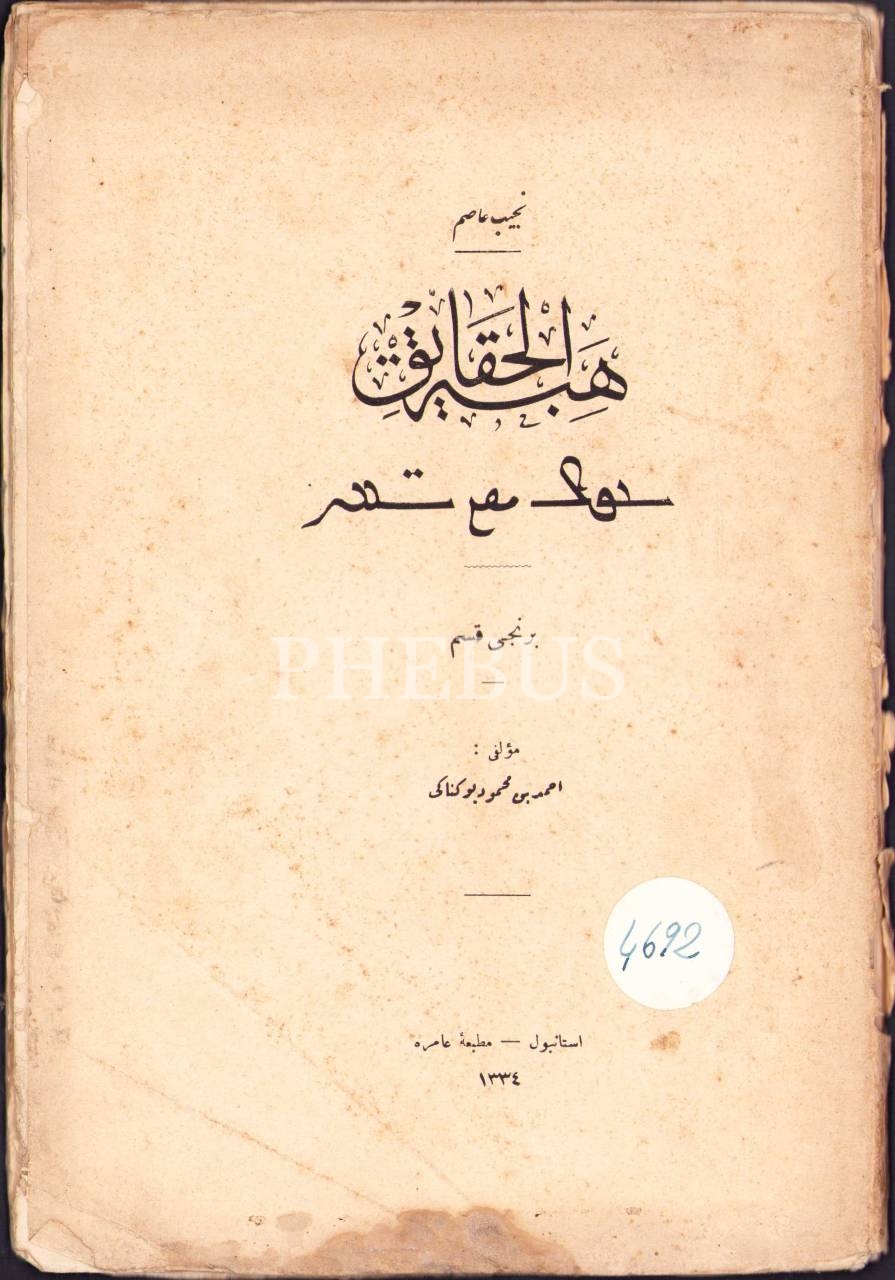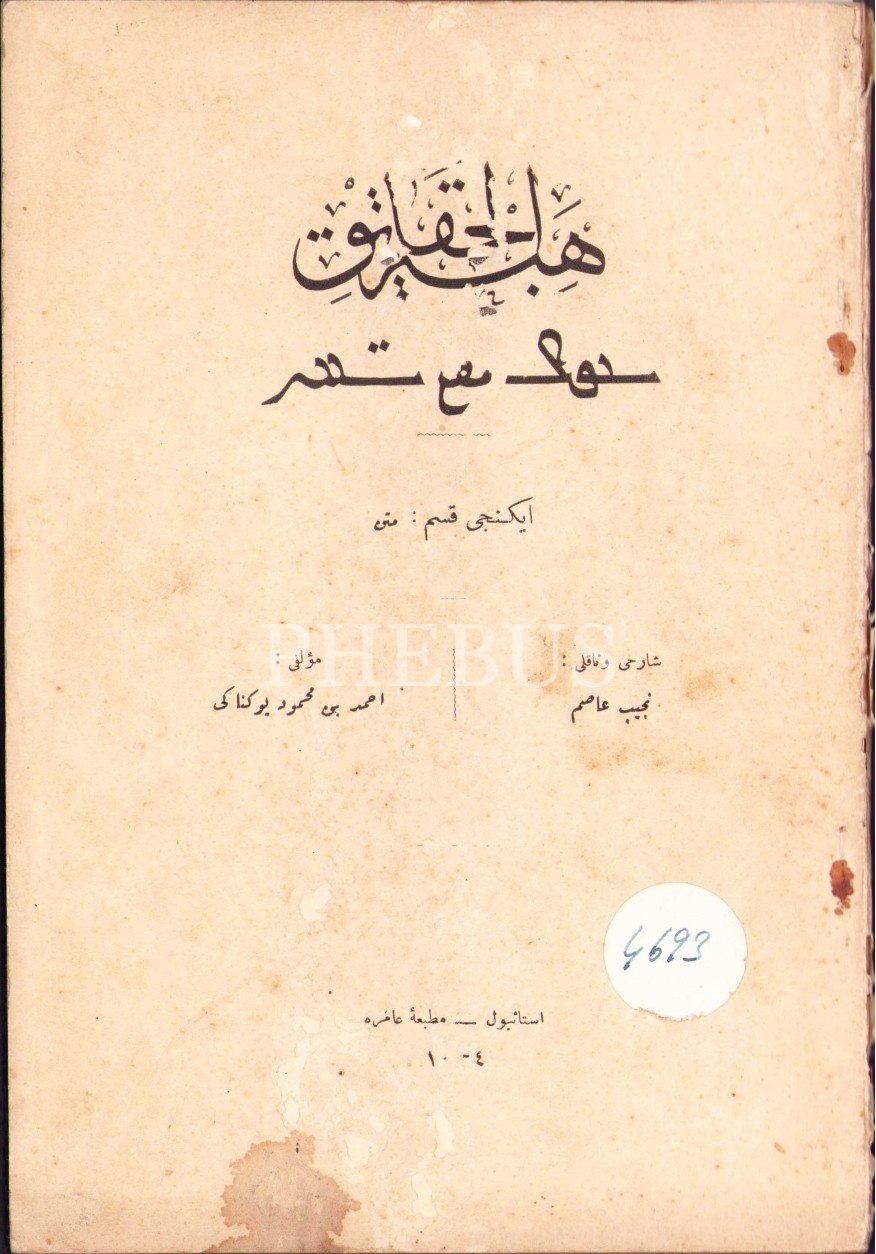 Osmanlıca Hibetü'l-Hakâik [2 kısım], Ahmed b. Mahmud Yükneki, çev. ve şerh: Necib Asım, Amire Matbaası, İstanbul 1334, 112+55 s., 17x25 cm, yıpranmış haliyle, ÖZEGE No: 7459