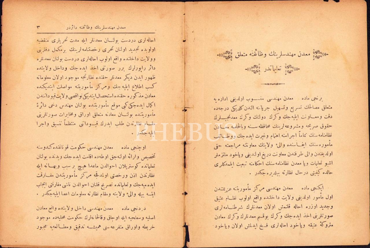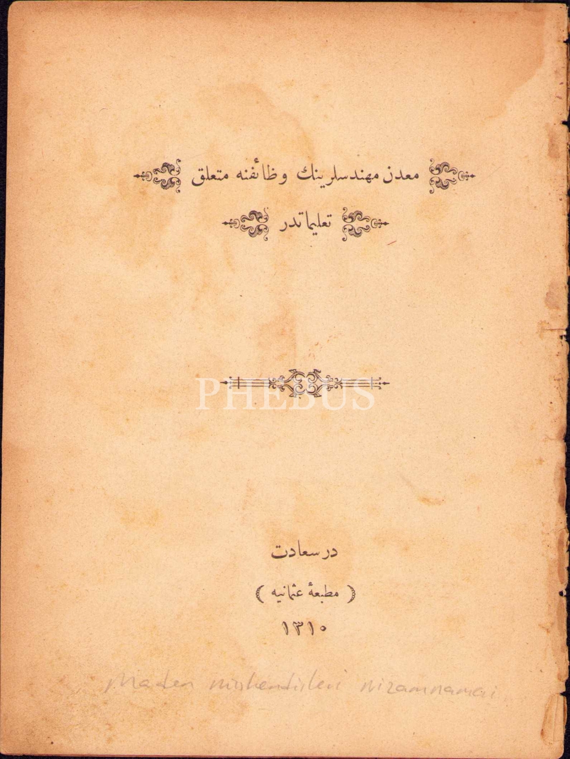 Osmanlıca Maden Mühendislerinin Vezâifine Müteallik Ta'lîmâtdır [Maden Mühendislerinin Görevlerine İlişkin Talimatname], Osmaniye Matbaası, Dersaadet [İstanbul] 1310, 14 s., 13x18 cm