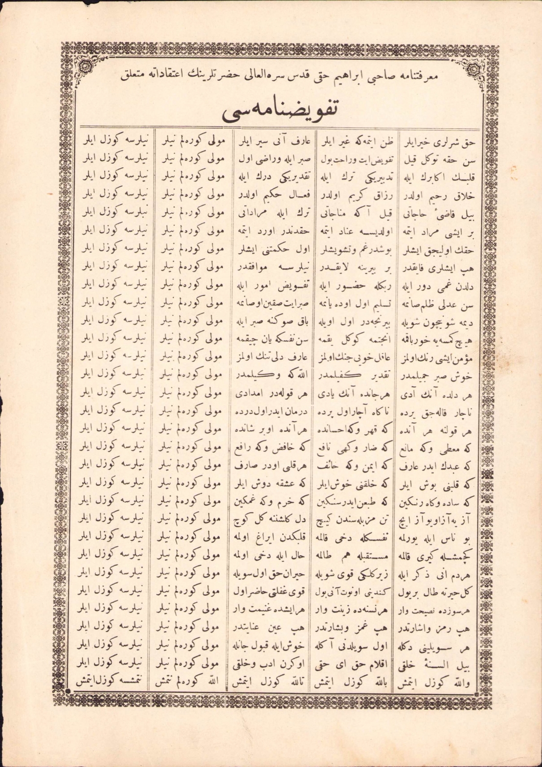 Maarifetname sahibi İbrahim Hakkı Kuddise Sırrahu'l-Aliye Hazretlerinin itikada müteallik Tefviznamesi, 20x28