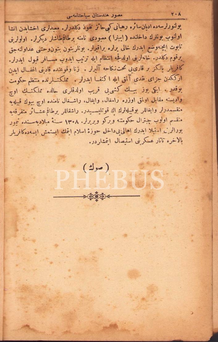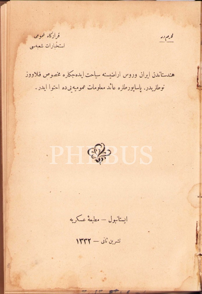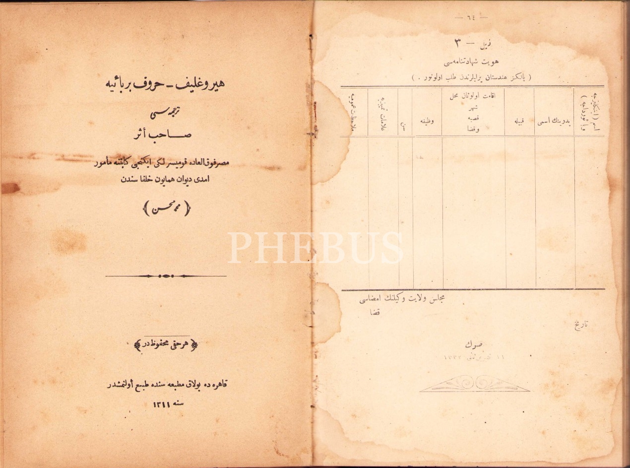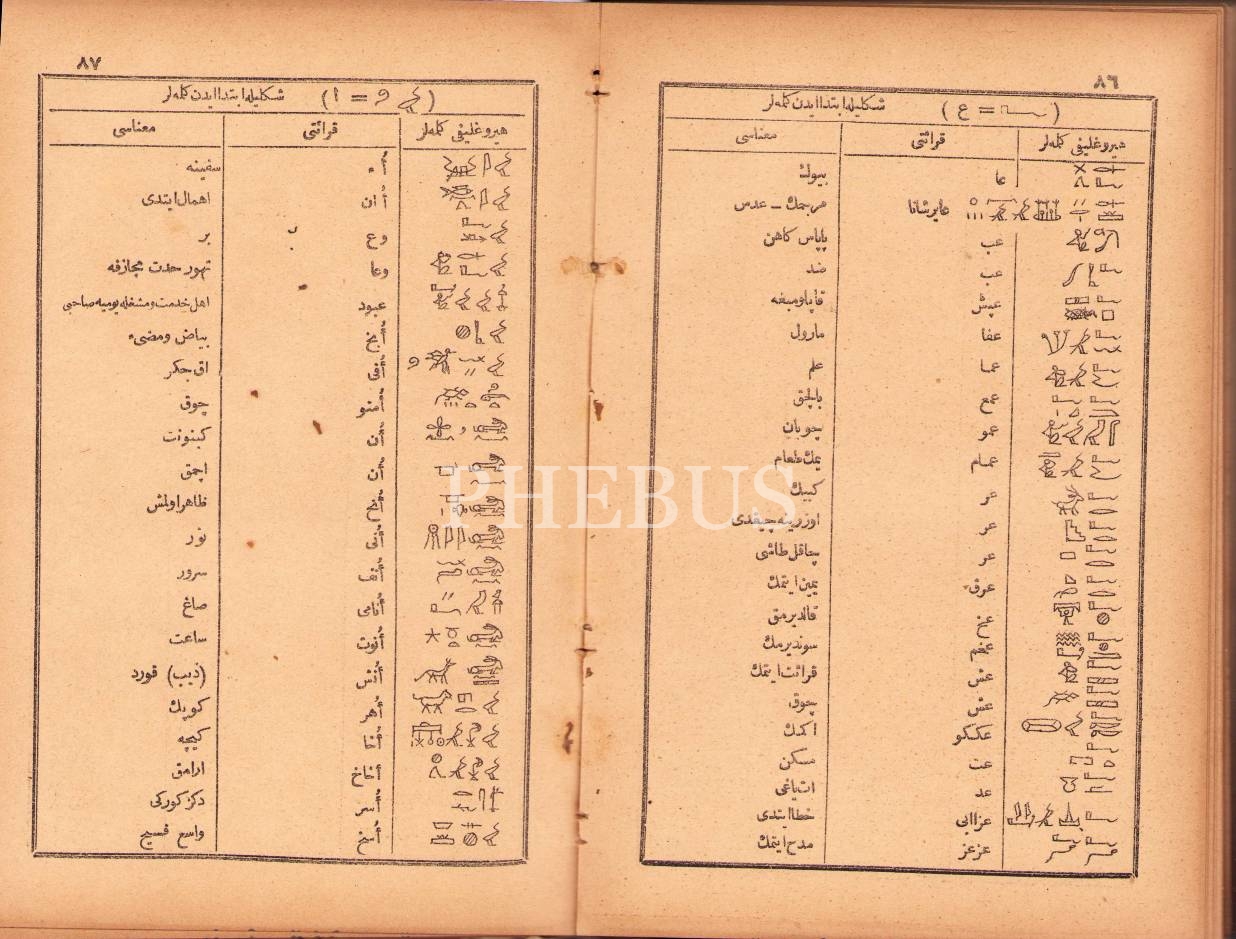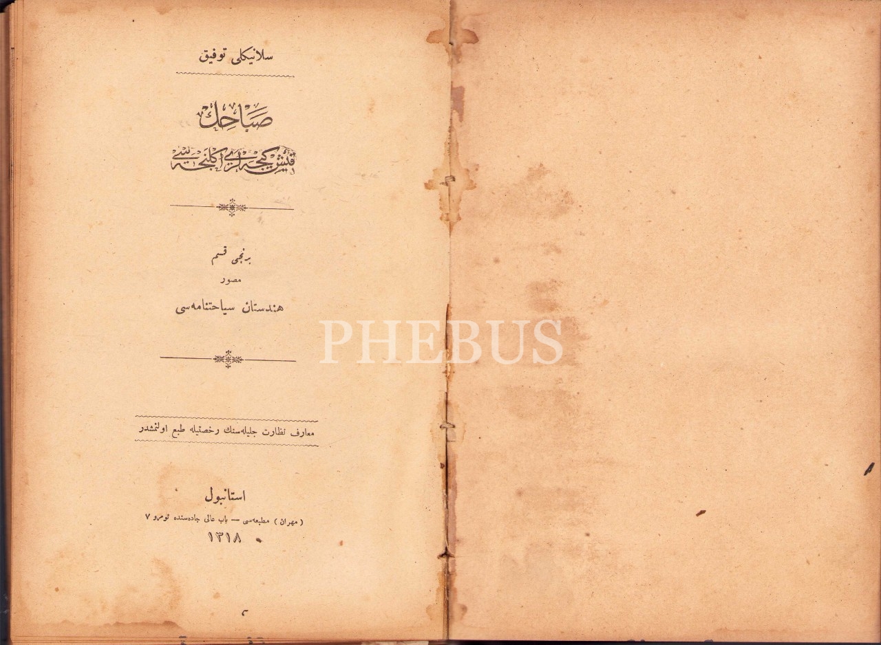 Hindistan'dan İran ve Rus Arazisine Seyahat Edeceklere Mahsus Kılavuz Notları, Karargâh-ı Umûmî İstihbârât Şubesi, Askerî Matbaa, İstanbul 1332, 64 s.; Hiyeroglif-Hurûf-ı Berbâiye Tercümesi, Mehmed Muhsin, Bulak Matbaası, Mısır 1311, 114 s.; Sabah'ın Kış Geceleri Eğlencesi [1. Kısım: Hindistan Seyâhatnâmesi] Selanikli Tevfik, Mihran Matbaası, İstanbul 1318, 208 s., 16x23 cm, cildi sırttan yıpranmış ve yorgun haliyle