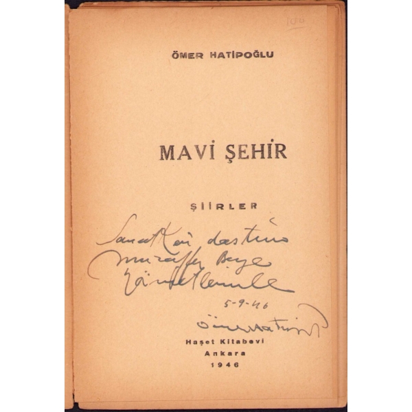 Şâir Ömer Hatipoğlu'dan İthaflı ve İmzalı "Mavi Şehir -Şiirler-, Haşet Yayınevi, Ankara, 1946, Çankaya Matbaası, 31 sayfa, 13x19 cm