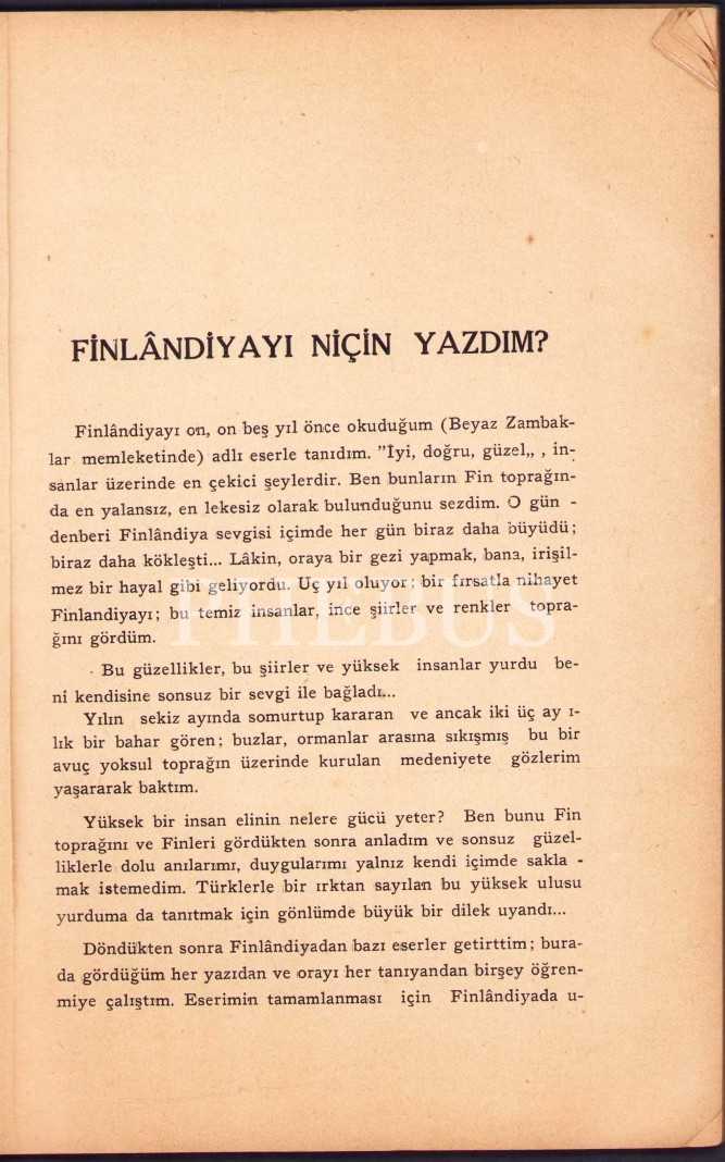 İthaf, "Beylû'ya 26.5. 1942 Şükûfe Nihâl" şeklindedir. Kitap, Şükûfe Nihâl Başar'ın Finlandiya gezisi intibâlarını içermektedir. Yazar eserinde Finlandiya'nın farklı özelliklerini tanıtmakta, anlatmaktadır.