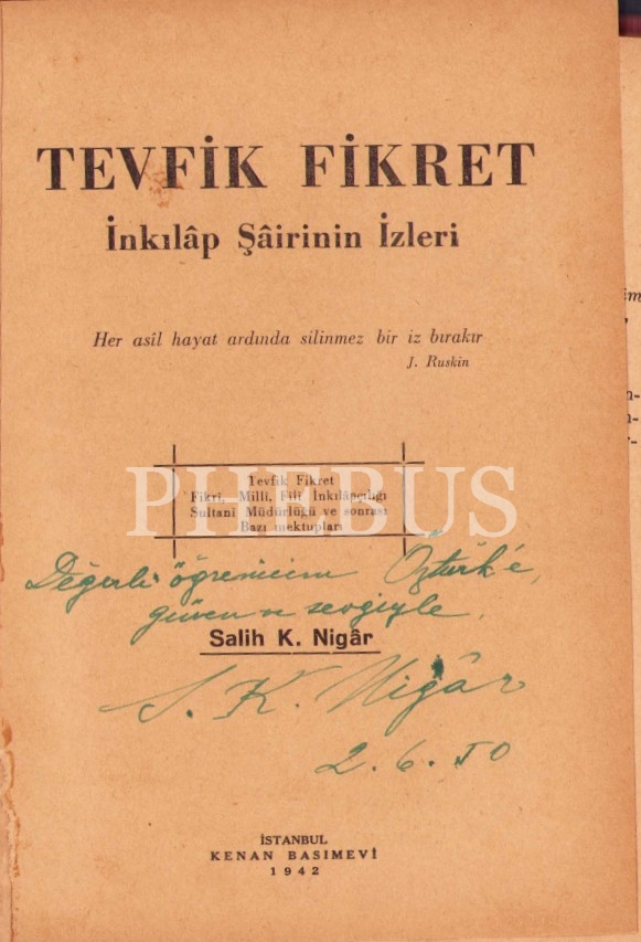 Şair Nigar Hanım'ın Oğlu Sâlih Kerâmet Nigar'dan İthaflı ve İmzalı "Tevfik Fikret -İnkılap Şâirinin İzleri-, İstanbul Kenan Matbaası, 1942, 142 sayfa, ciltli, 14x20 cm