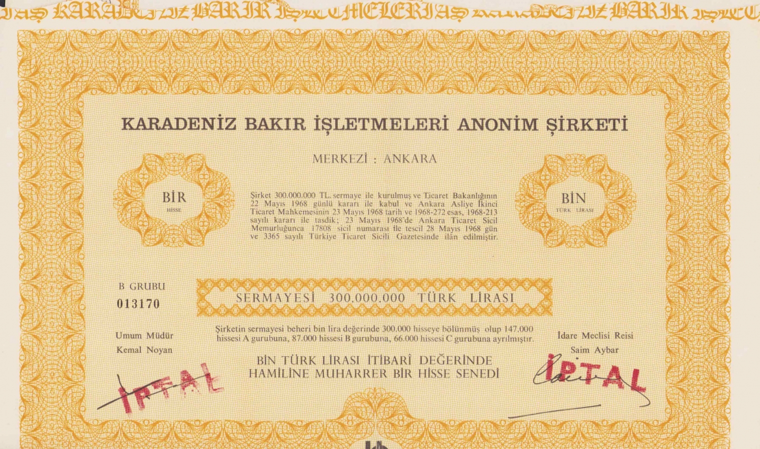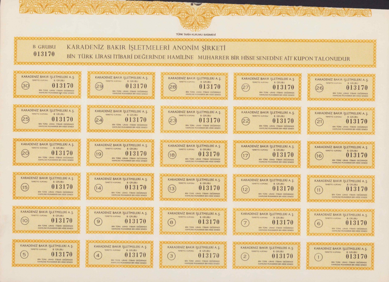 Karadeniz Bakır İşletmeleri Anonim Şirketi hisse senedi, 1 hisse, bin TL ederli, 44x34cm