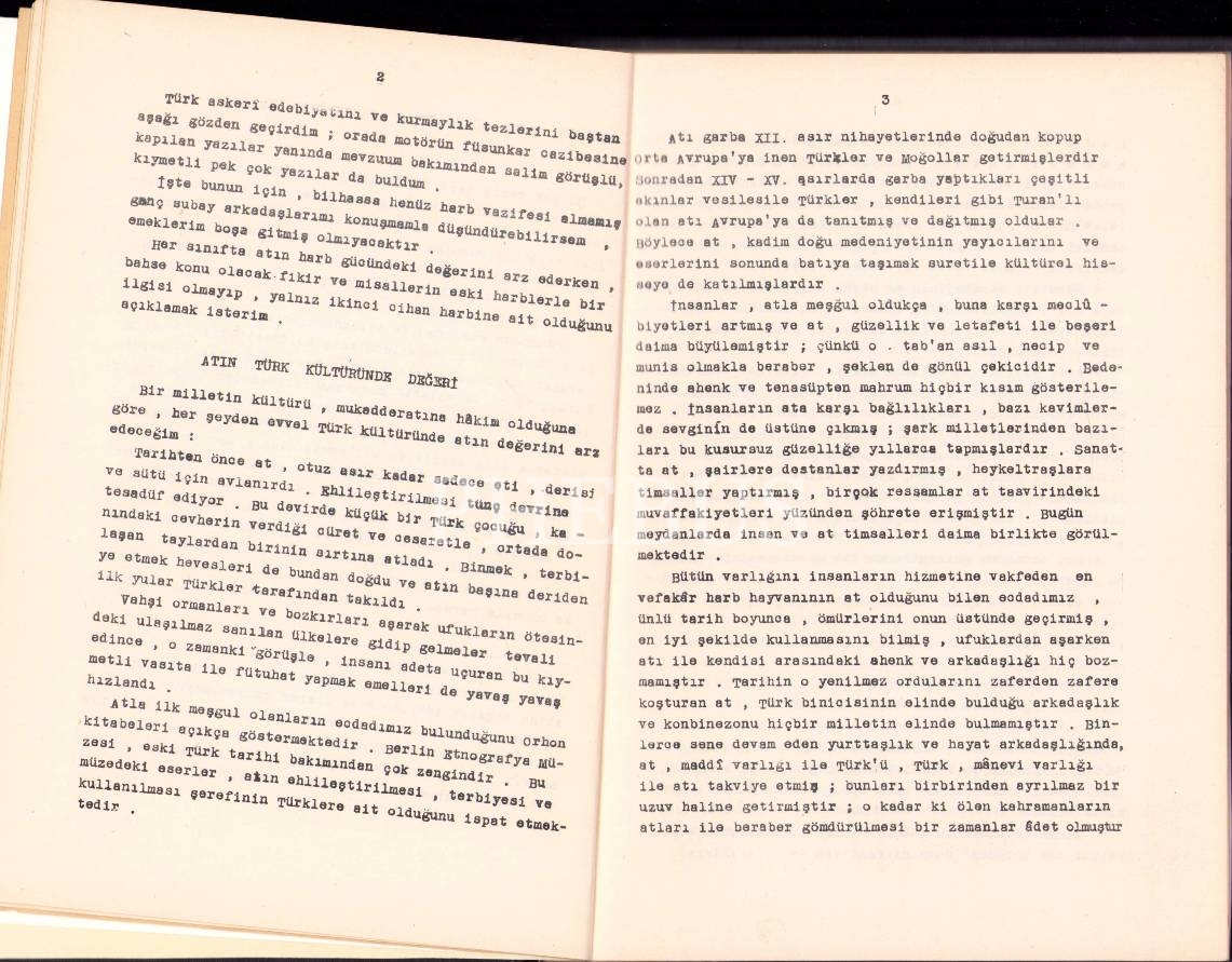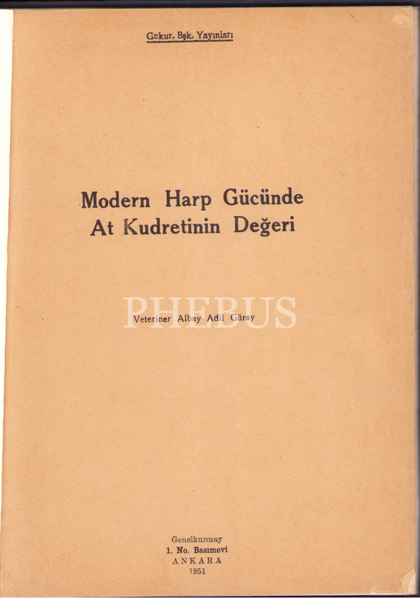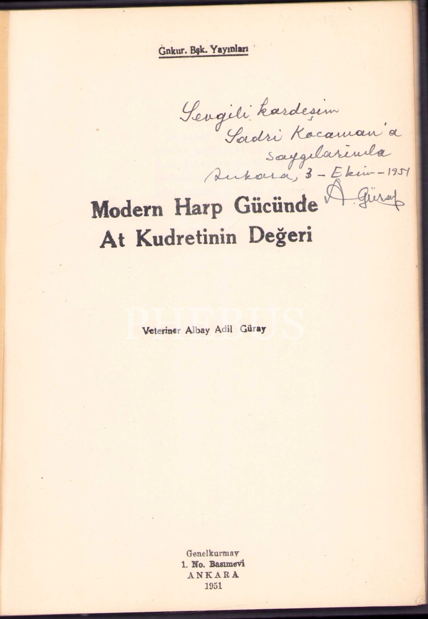 Veteriner Albay Adil Güray'dan İthaflı ve İmzalı "Modern Harp Gücünde At Kudretinin Değeri", Genelkurmay Yayınları, 1. No Basımevi, Ankara, 1951, 96 sayfa, 19x25 cm