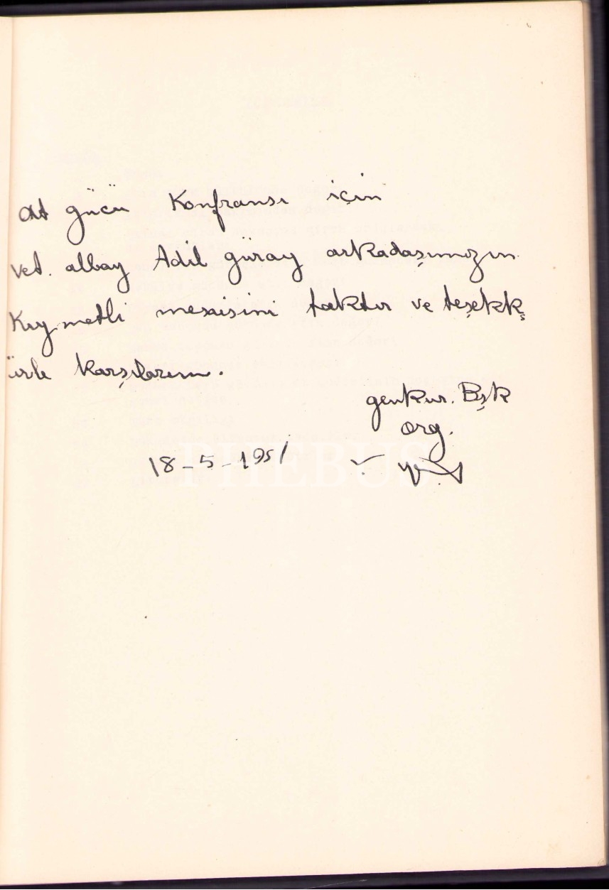 İthaf, "Sevgili kardeşim Sadri Kocaman'a saygılarımla, Ankara, 3 Ekim 1951 A. Güray" şeklindedir.