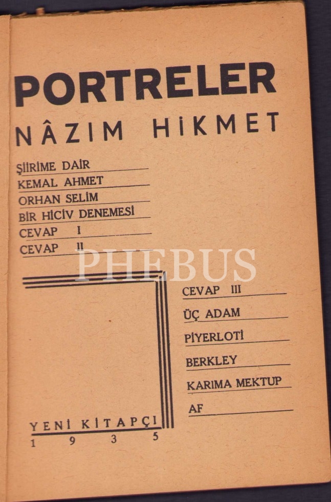 Portreler, Nazım Hikmet, İlk Baskı, Yeni Kitapçı, Şirket-i Mürettibiye Matbaası, 62 sayfa, haliyle, 12x17 cm