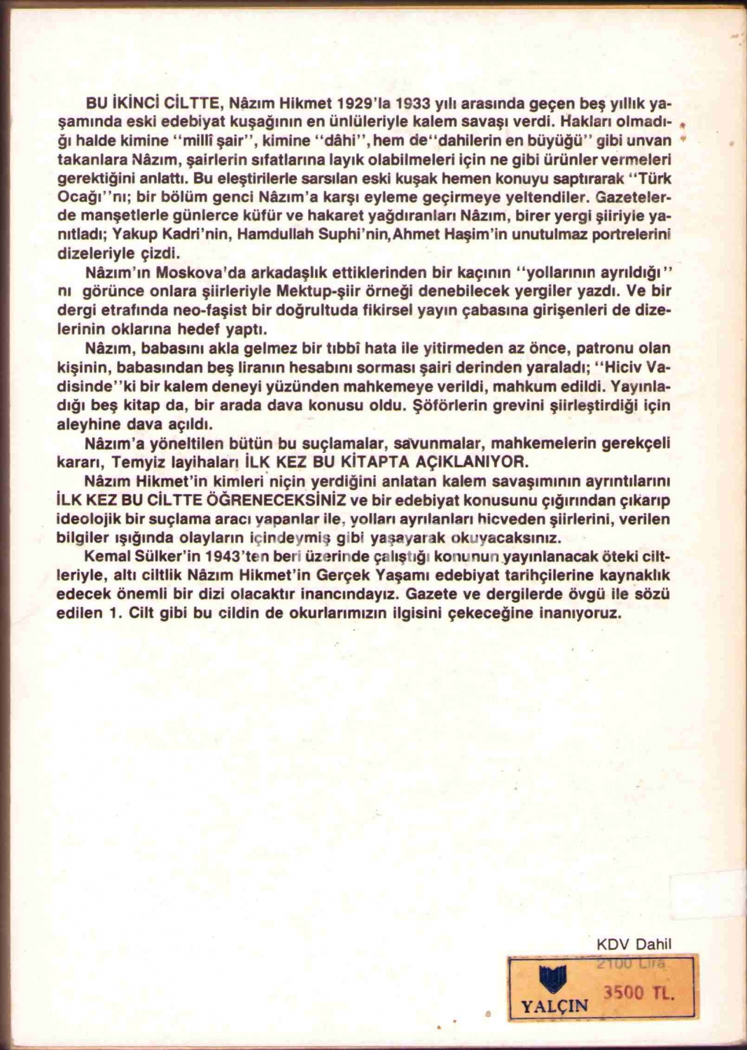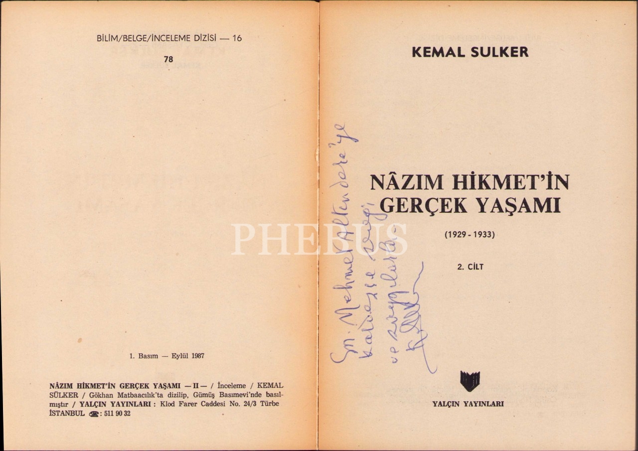 Kemal Sülker'den İthaflı ve İmzalı "Nâzım Hikmet'in Gerçek Yaşamı", İlk Baskı, 1967, 2. Cilt, Yalçın Yayınları, 260 sayfa, 13x19 cm