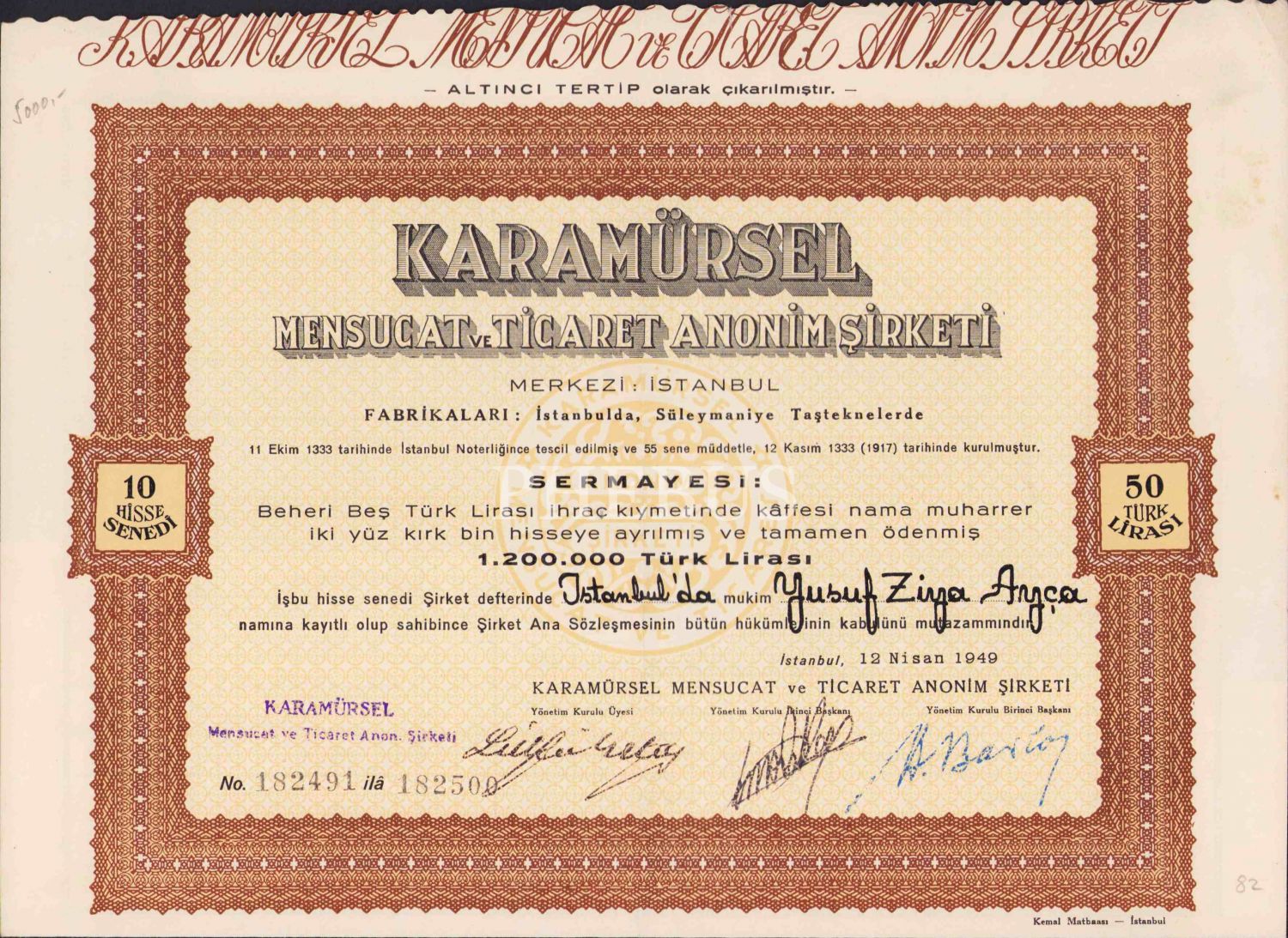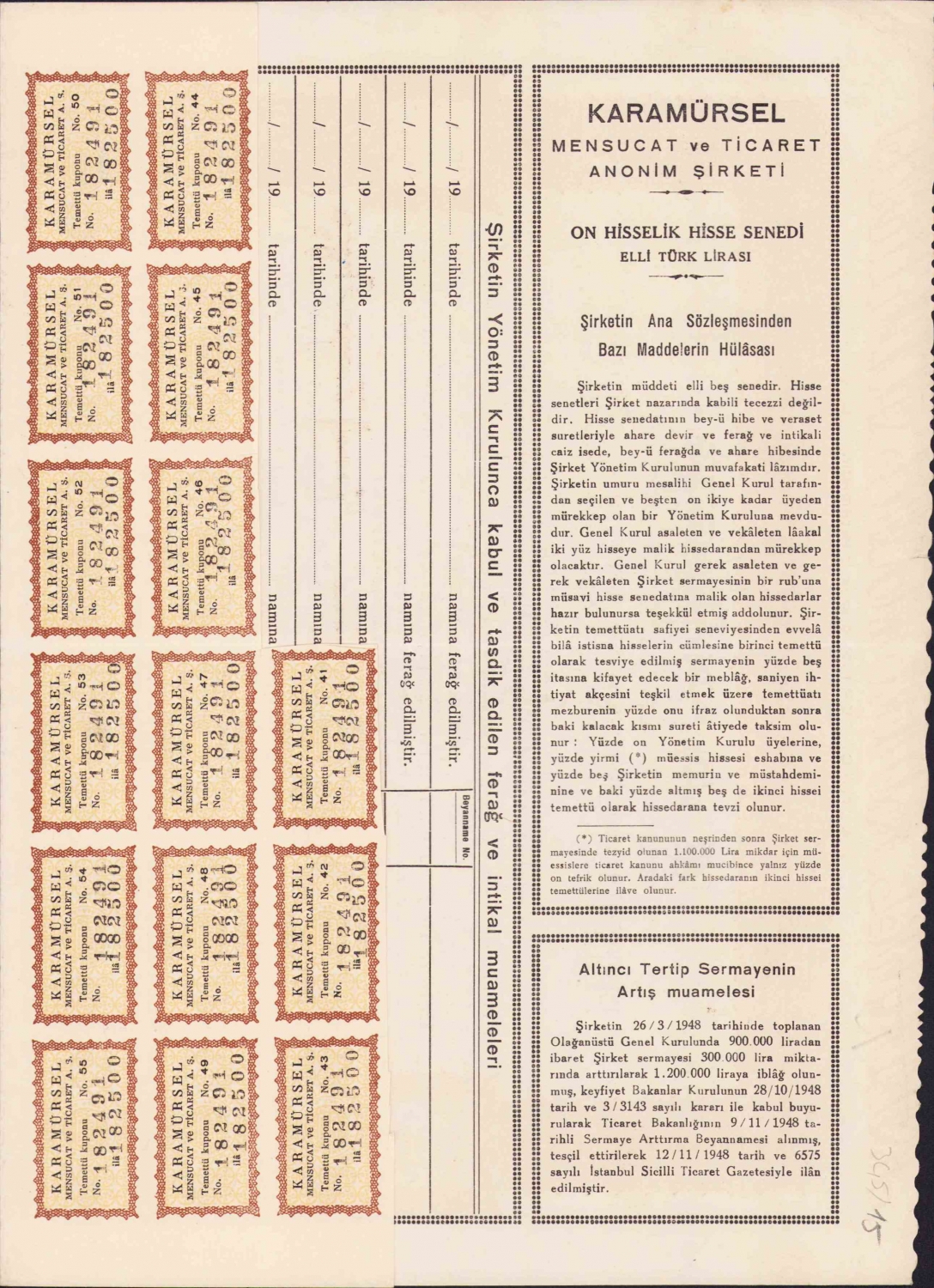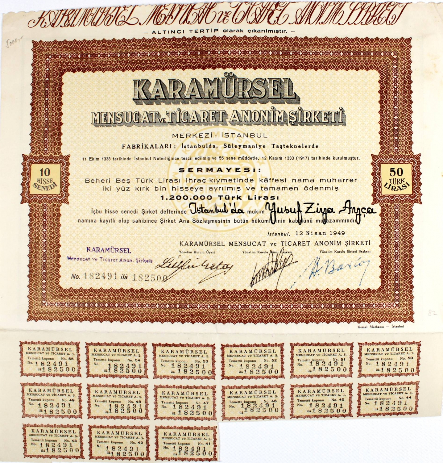 Karamürsel Mansucat ve Ticaret Anonim Şirketi hisse senedi, 10 hisse, 50 Türk Lirası ederli, 30x30cm
