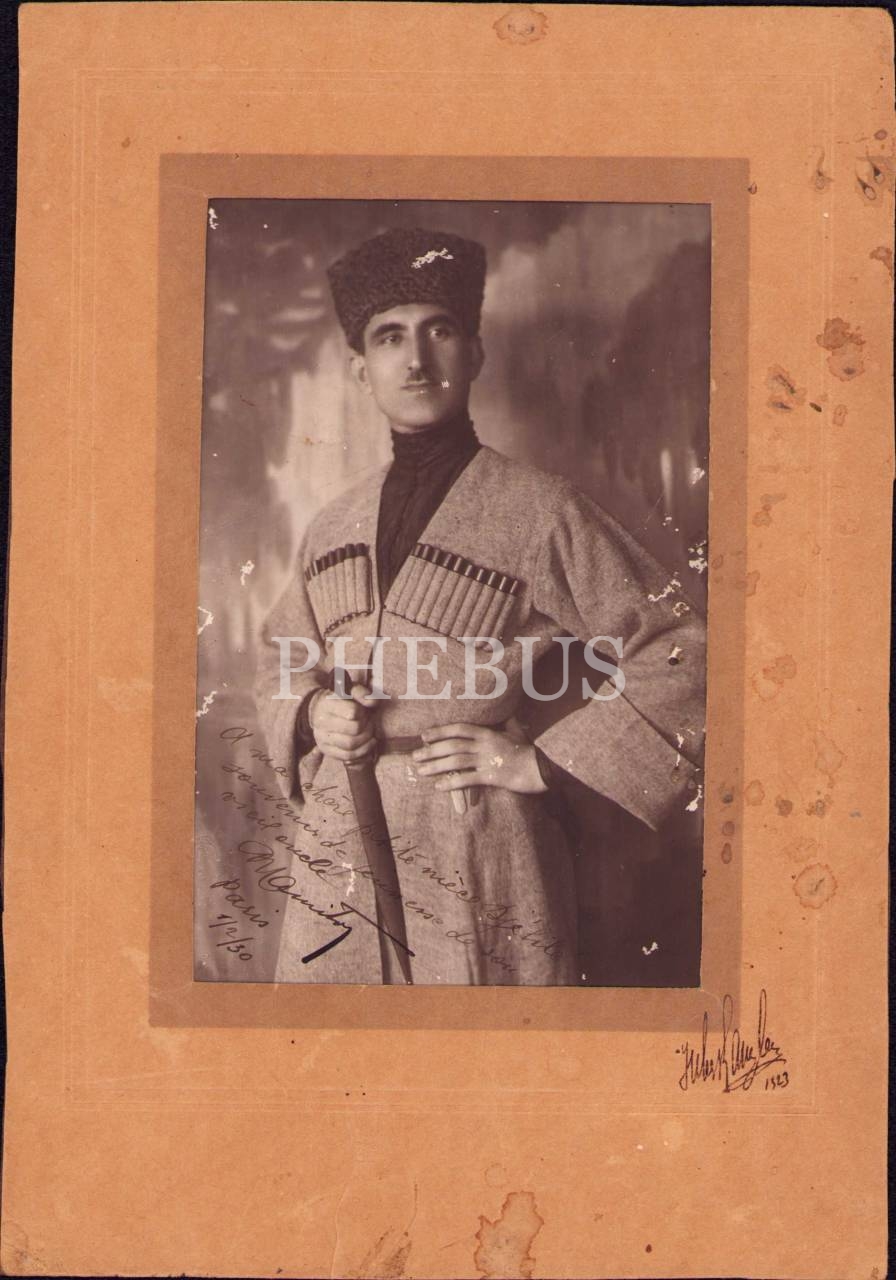 Kafkas kıyafetli Fransızca ithaflı şahıs fotoğrafı, Paris 1930, kartona yapışık, 11x15 cm, fotoğraf yıpranmış haliyle