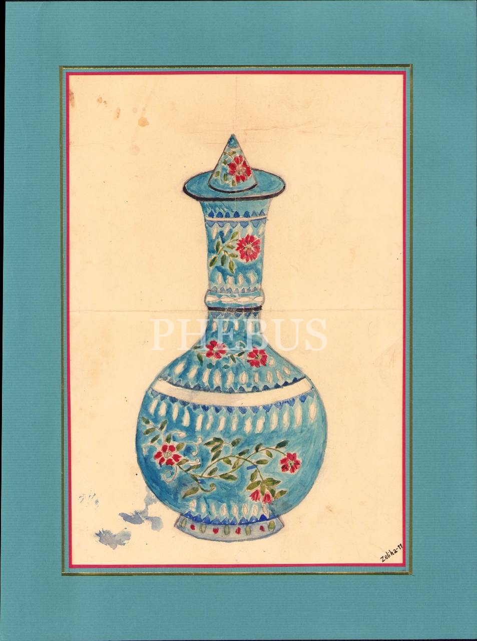 Zeliha-99 imzalı porselen vazo çizimi, paspartulu, çizim: 20x30 cm