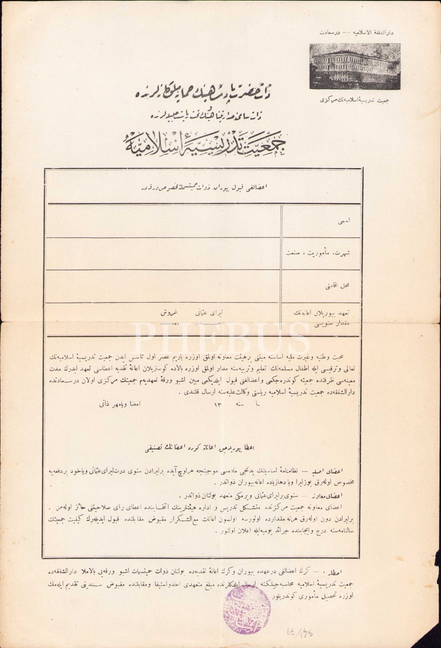 Osmanlıca Cemiyet-i Tedrisiye-i İslamiye boş üyelik belgesi, 25x37 cm