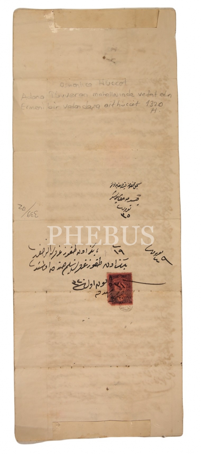 Adana'da vefat eden bir Ermeni vatandaşın ailesine ait mirasa dair Osmanlıca hüccet, 1322 tarihli, 18x46 cm