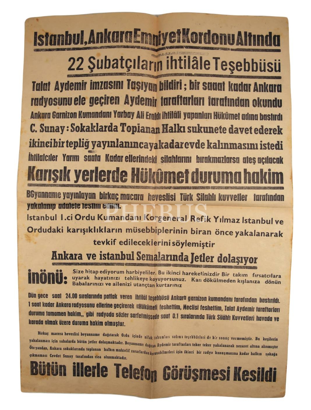 Talat Aydemir önderliğindeki 22 Şubat 1962 askeri darbe girişimine dair haber afişi, 41x56 cm