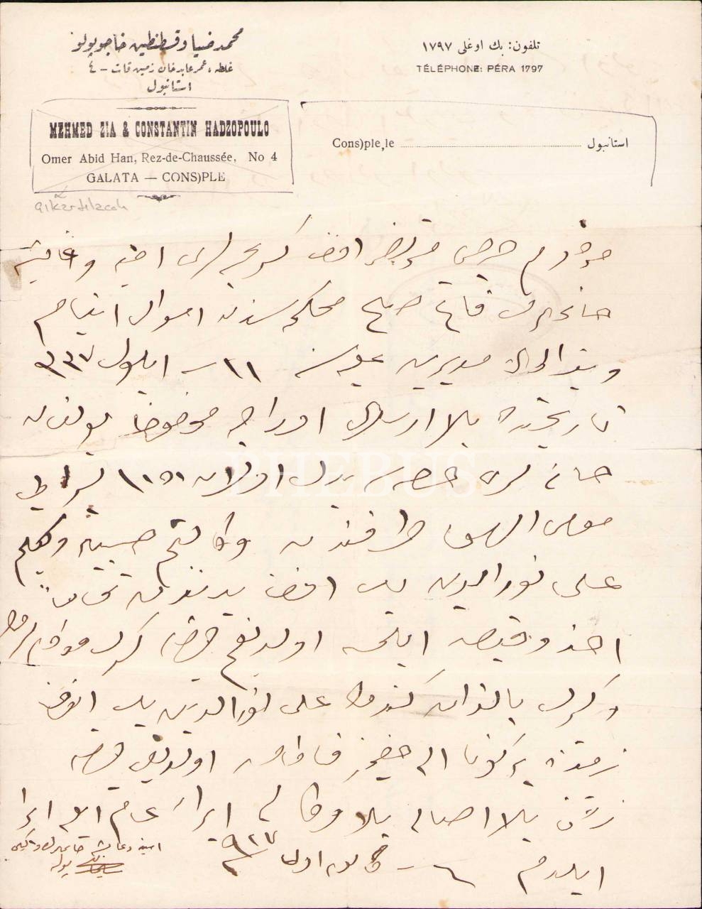Mehmed Ziya ve Constantin Hadzopoulo antetli kâğıtta 1927 tarihli Osmanlıca mektup, 21x27 cm, bir kenarı yırtık haliyle