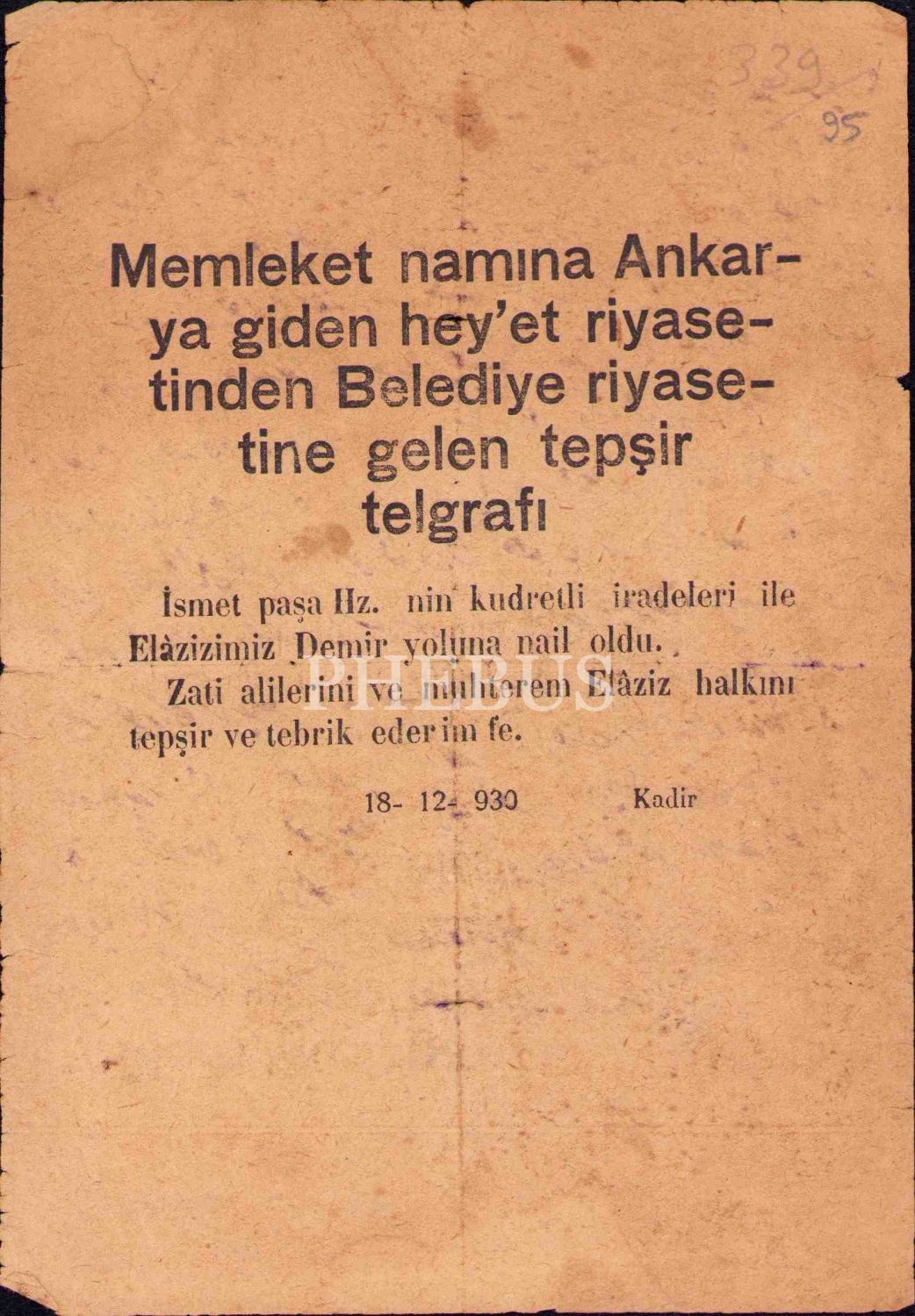 "İsmet paşa Hz. Nin kudretli iradeleri ile Elazizimiz Demir yoluna nail oldu. Zati alilerini ve muhterem Elâziz halkını tepşir ve tebrik ederim fe."