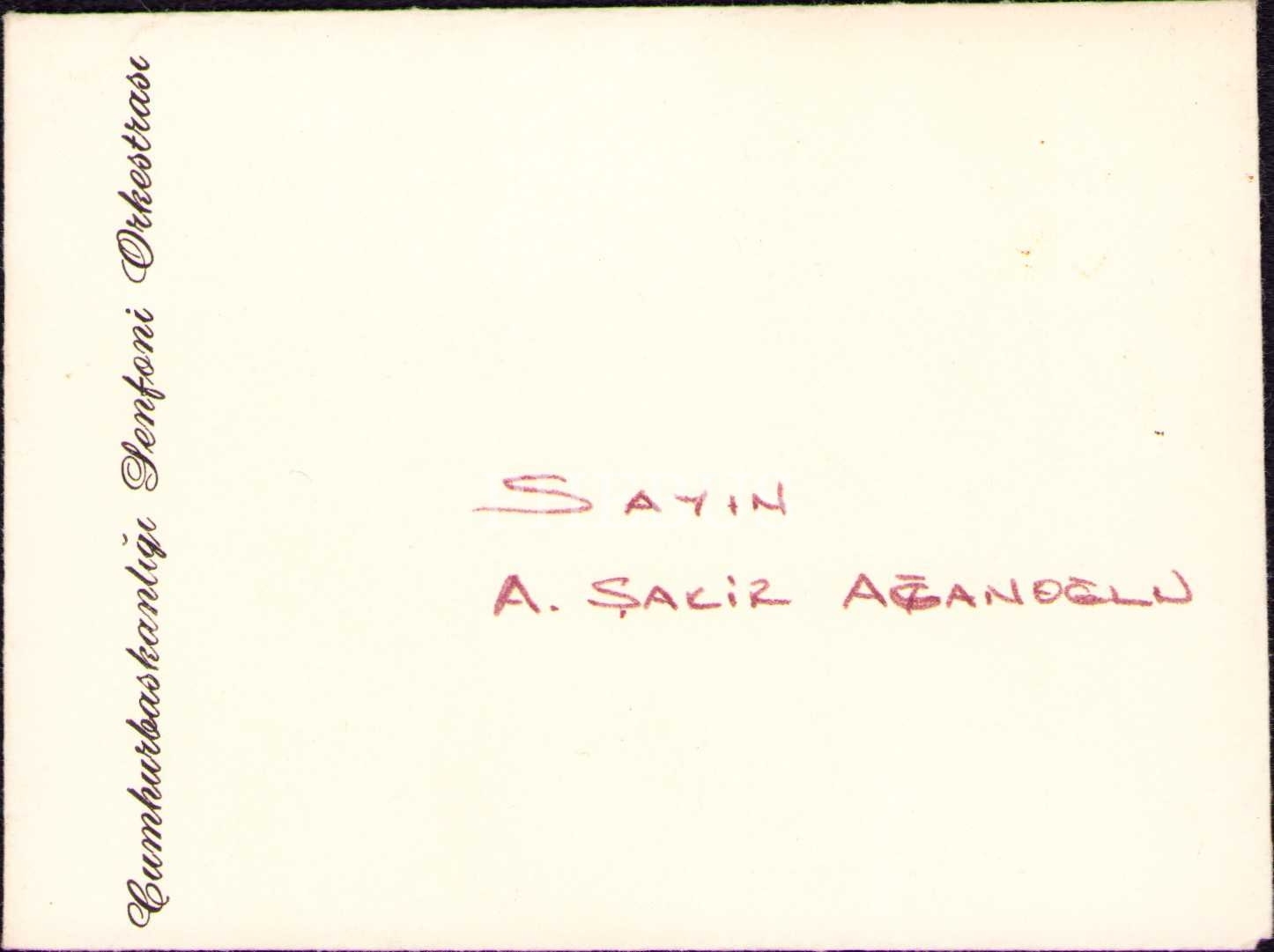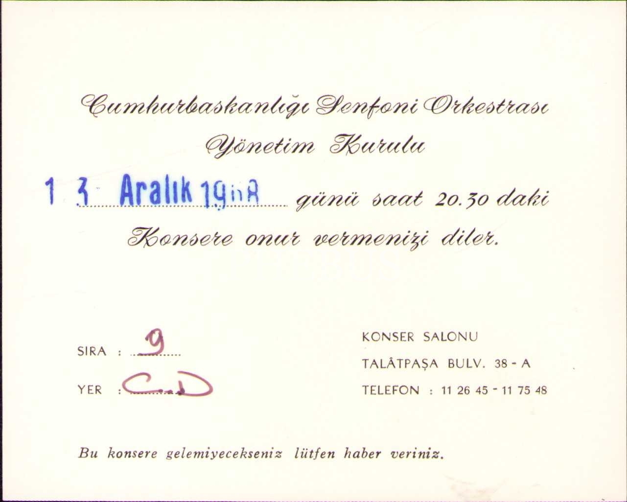 Cumhurbaşkanlığı Senfoni Orkestrası'ndan A. Şakir Ağanoğlu'na konser davetiyesi, 1968 yılı, 9x11 cm