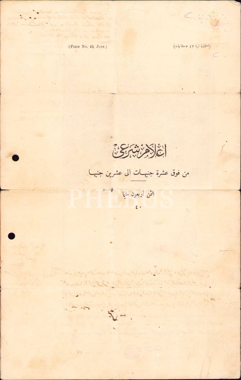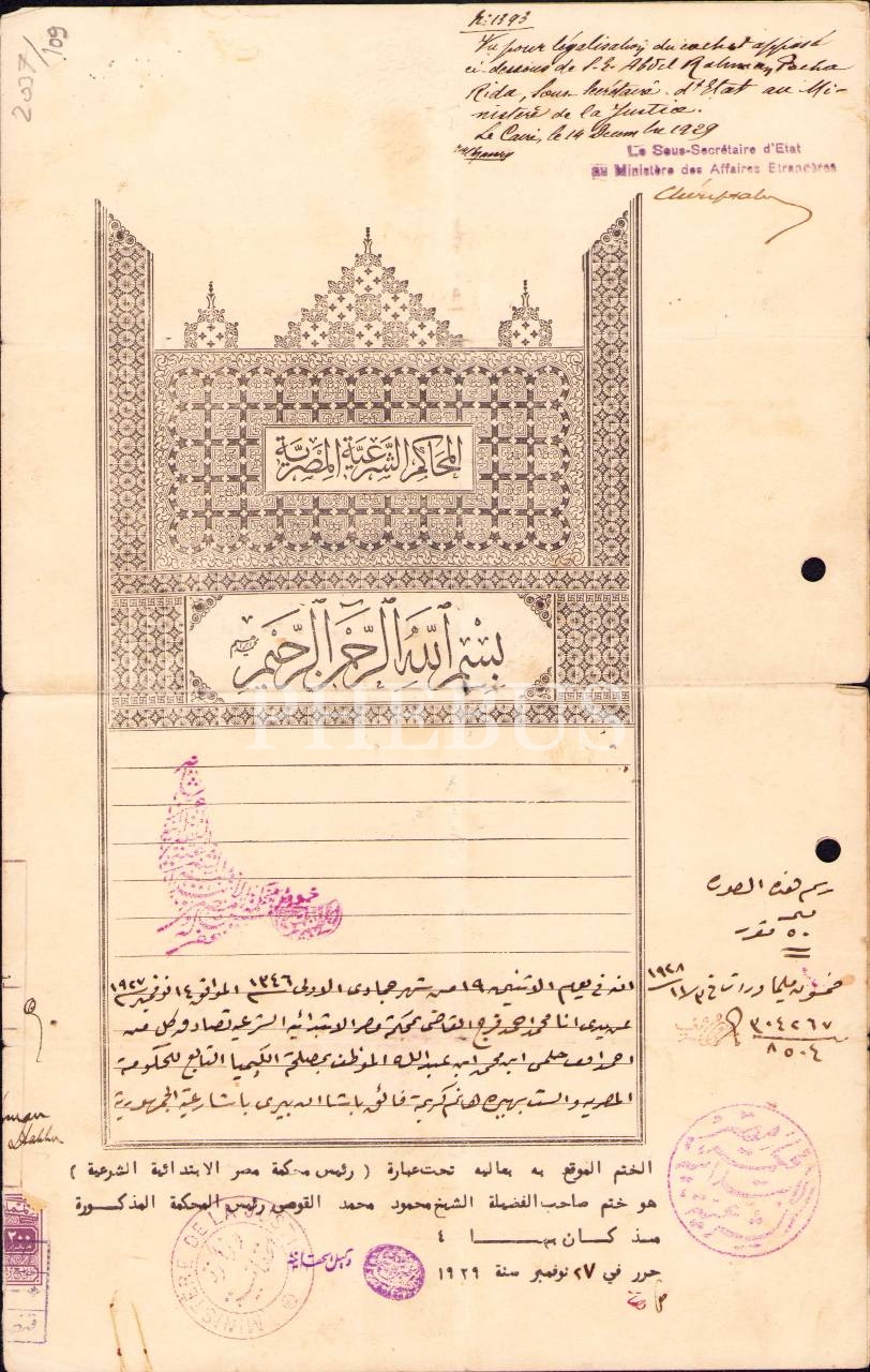 Mısır Şer'î Mahkemeleri antetli Arapça ilam, Mısır 1929, 21x33 cm, yorgun haliyle