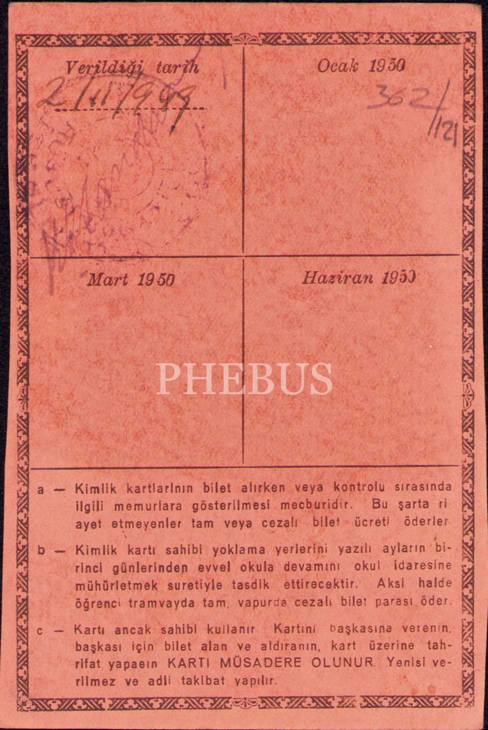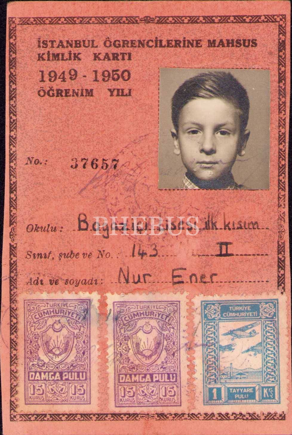 Fotoğraflı öğrenci kimlik kartı, Boğaziçi Lisesi, 1949-1950 öğrenim yılı, 8x12 cm