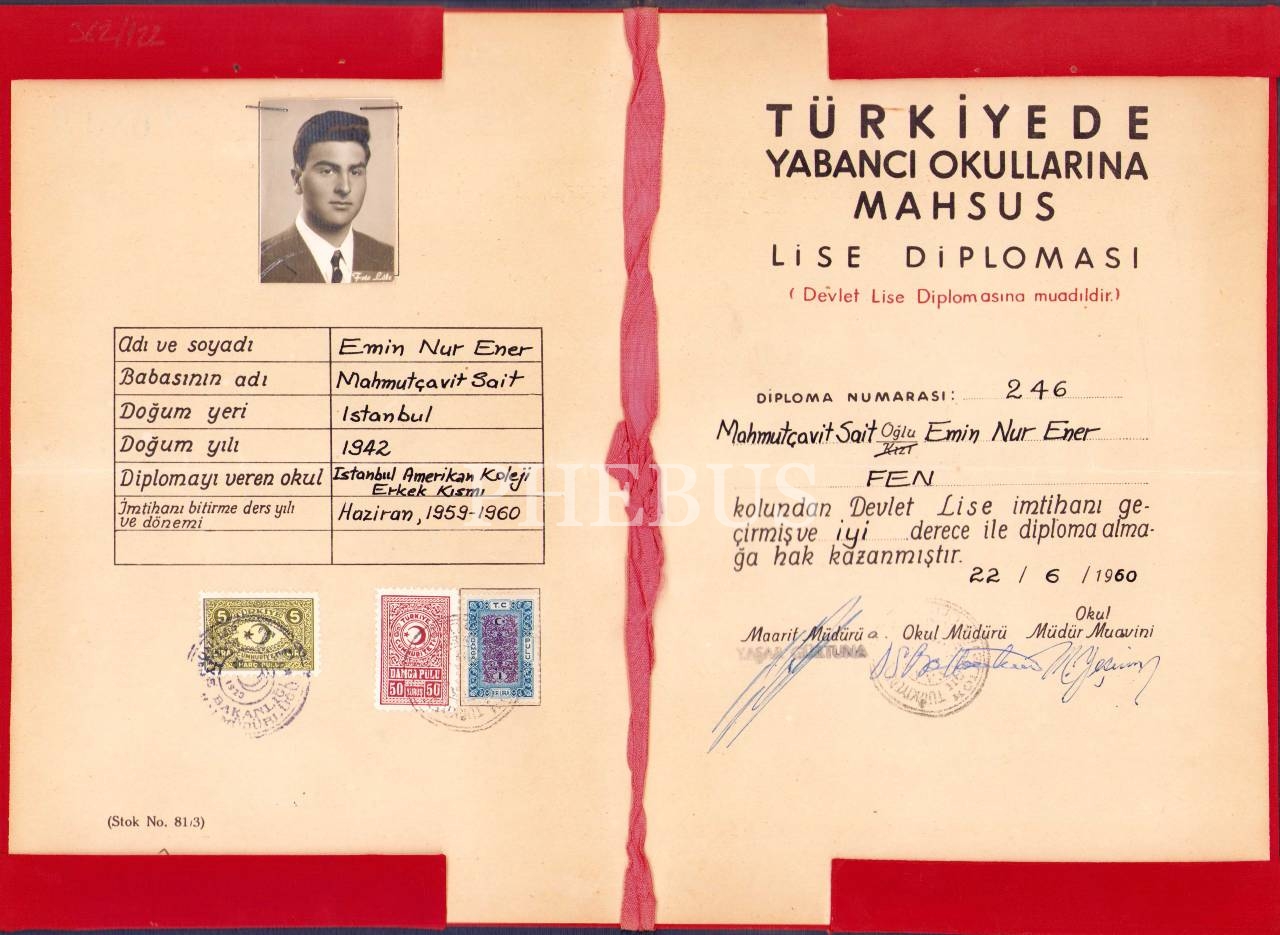 İstanbul Amerikan Koleji fotoğraflı lise diploması, 1960, 25x35 cm