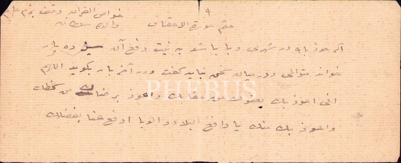 Bir şehirde veba çıkması halinde okunacak duaya dair Farsça metin, 9x22 cm, üst kenardan yırtık haliyle