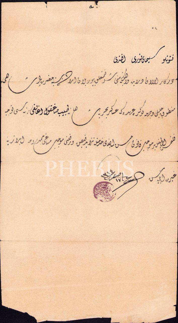 1314 tarihli Osmanlıca berat, Süleyman Nuri Efendi'ye Asakir-i Bahriye-i Şahane Tabib Sağkol Ağalığı rütbesi verildiğine dair, 22x41 cm, alt kenardan yırtık haliyle