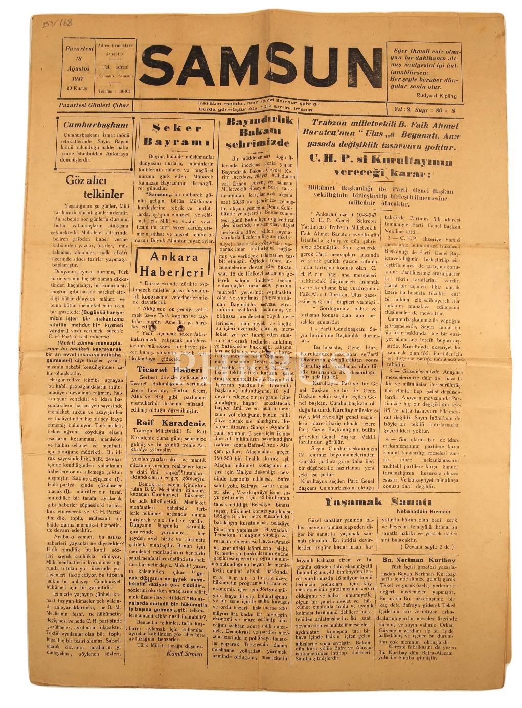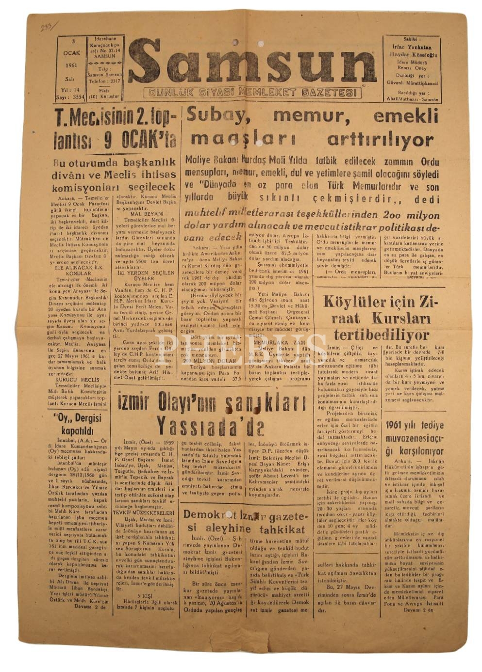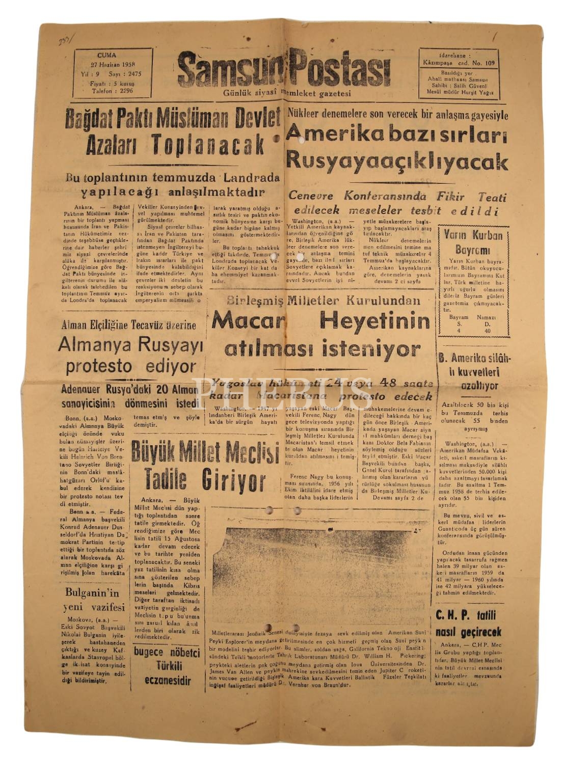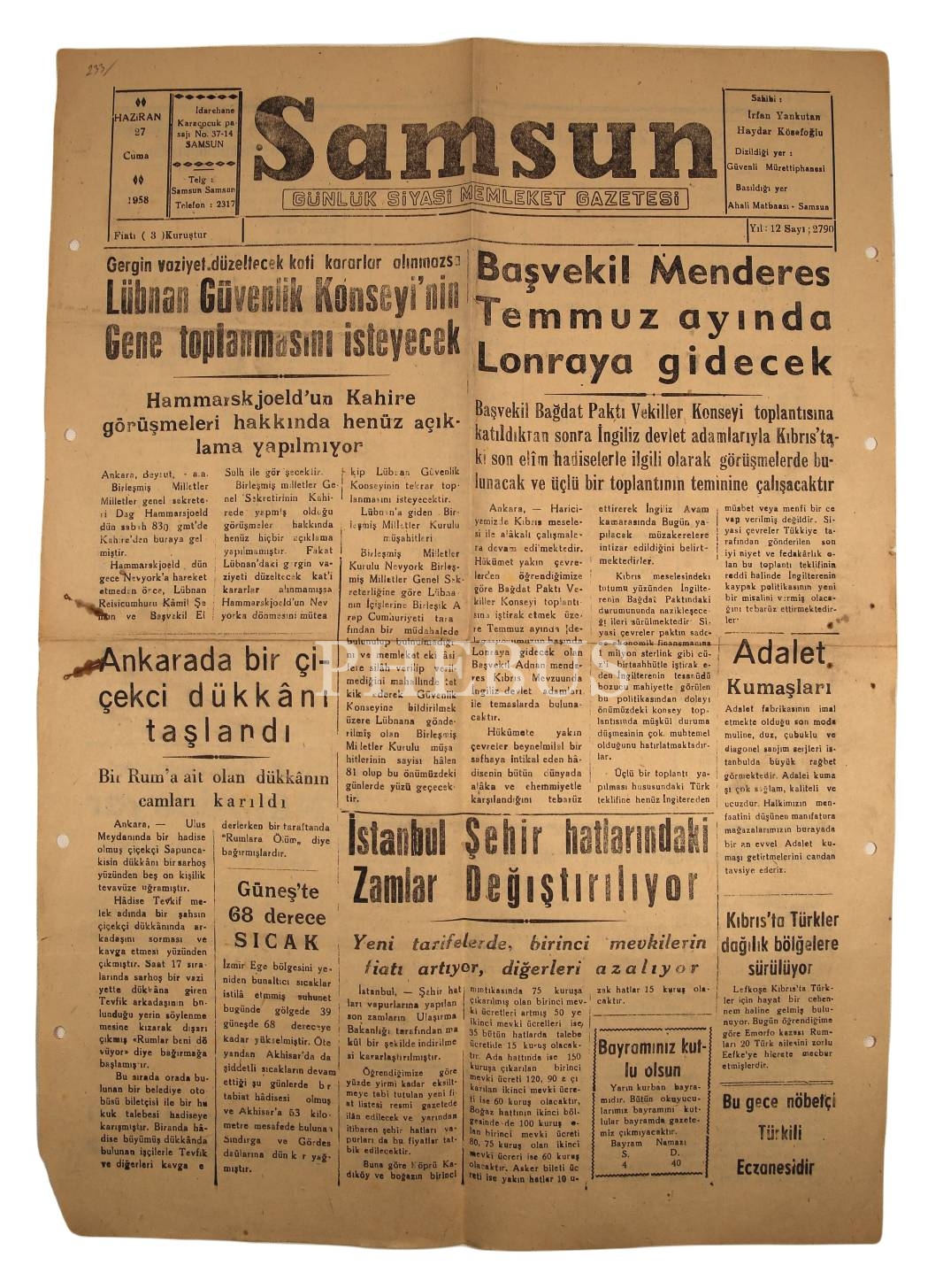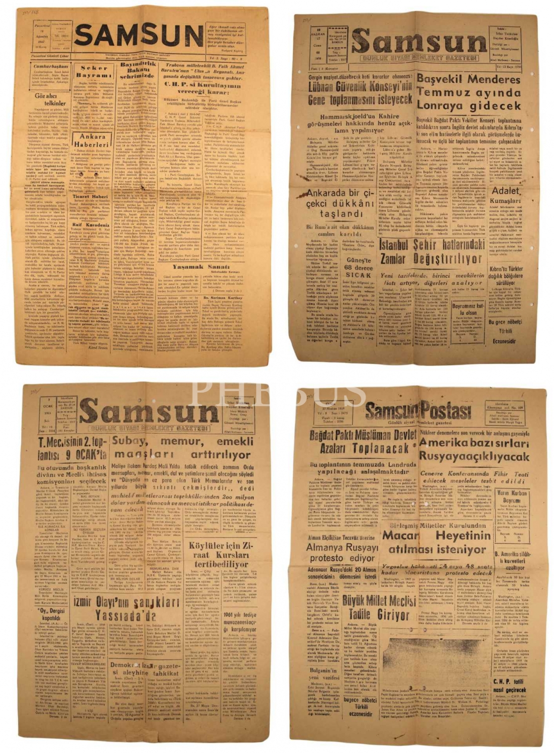 3 adet Samsun gazetesi [18 Ağustos 1947, 27 Haziran 1958 ve 3 Ocak 1961] ve 1 adet Samsun Postası gazetesi [27 Haziran 1958], 35x49 cm