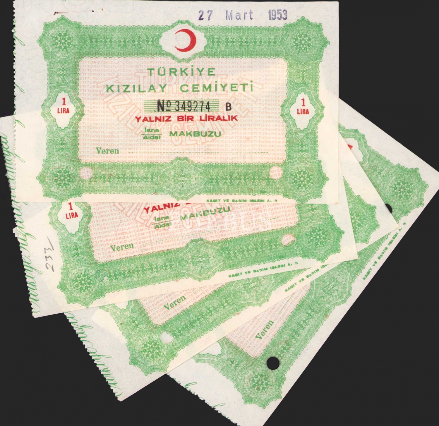 4 adet Türkiye Kızılay Cemiyeti makbuzu, 27 Mart 1953 tarihli, 8x14 cm