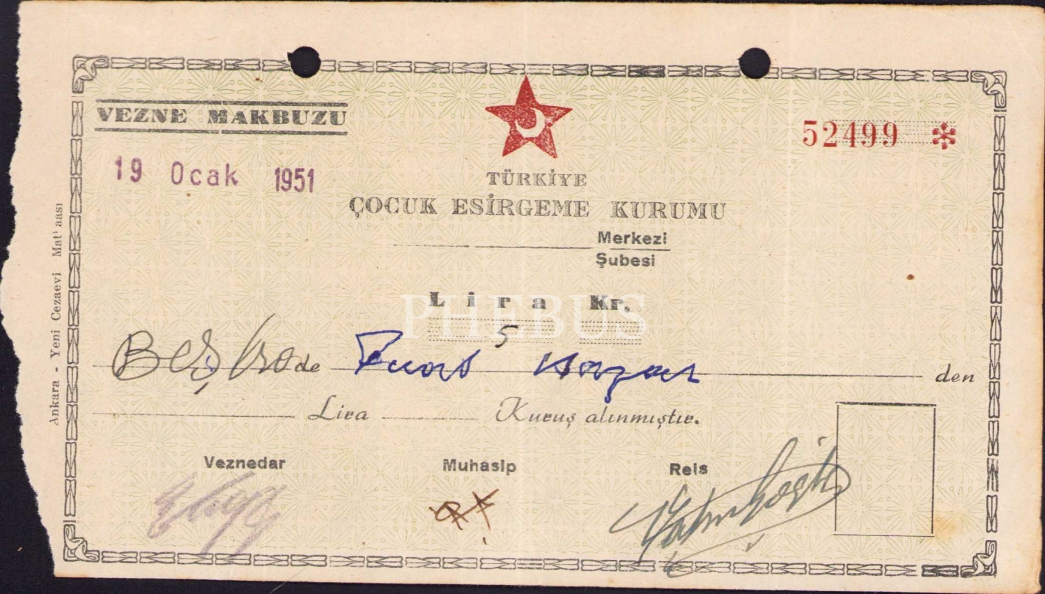 Türkiye Çocuk Esirgeme Kurumu makbuzu, 19 Ocak 1951 tarihli, 10x18 cm