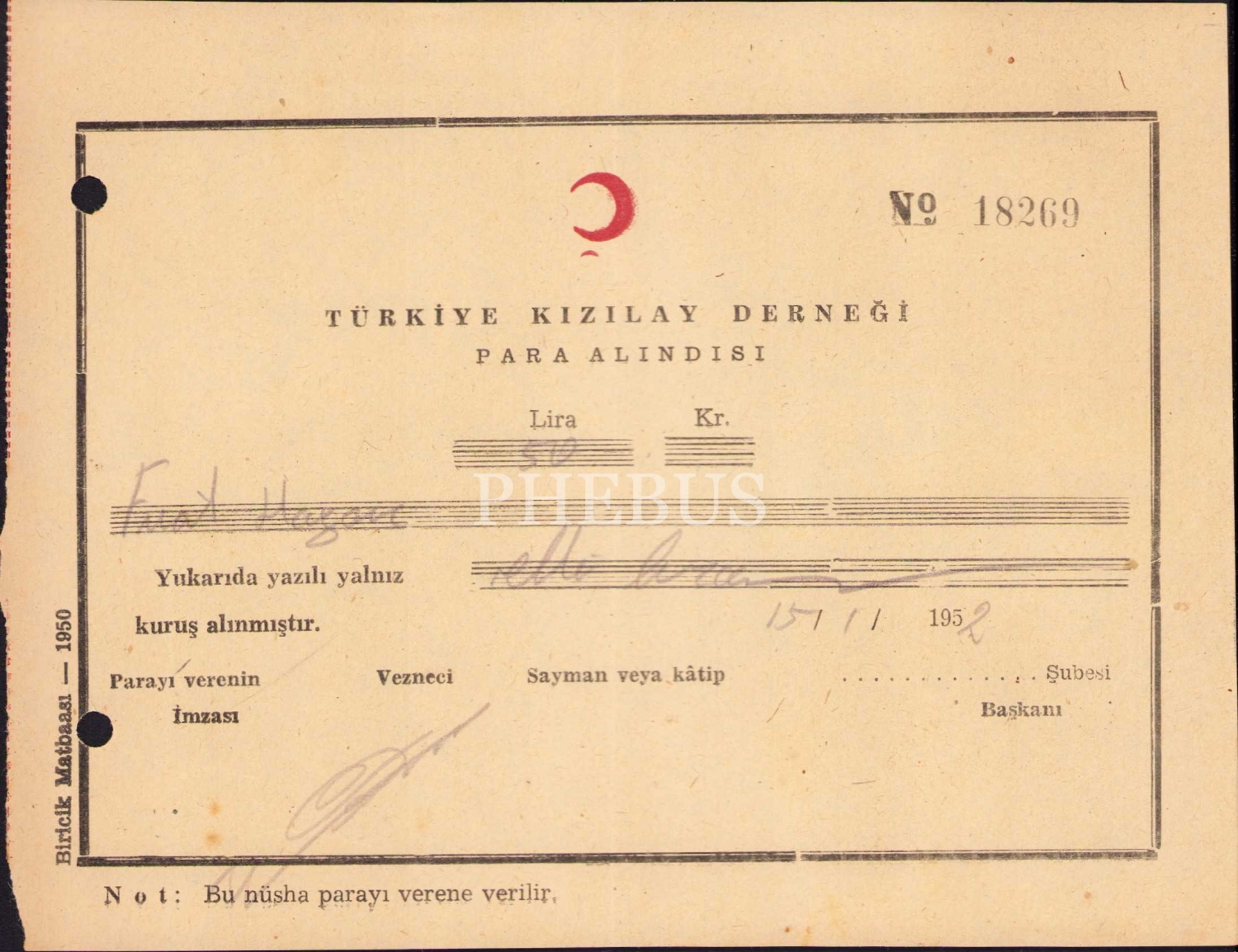 Türkiye Kızılay Derneği makbuzu, 1952 tarihli, 14x18 cm