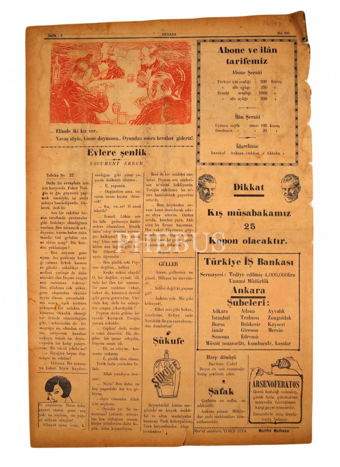 Akbaba gazetesi, 3 Kânunusani 1929, 4 sayfa, 29x45 cm, arka yüzünde bir kesik mevcut haliyle