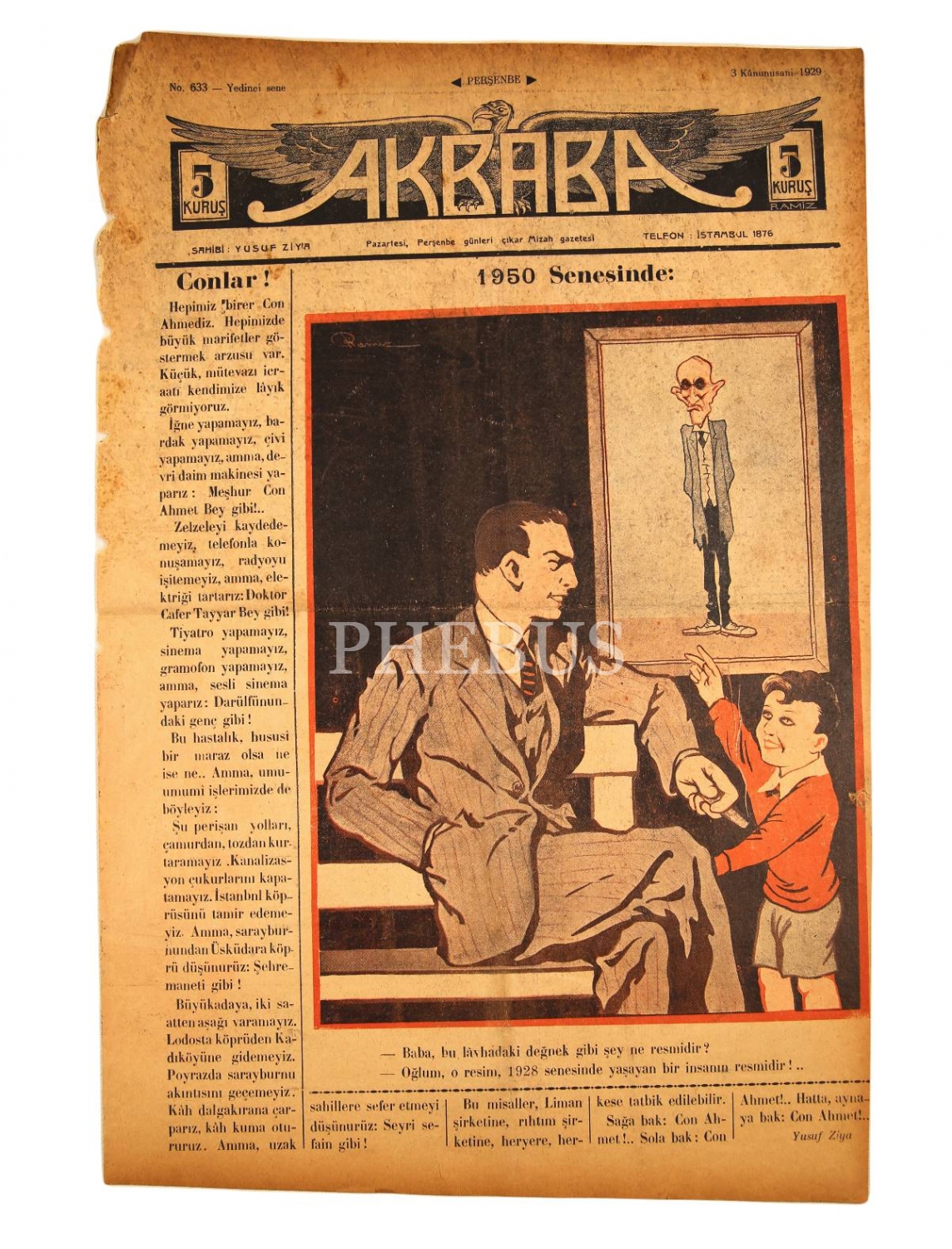 "1950 senesinde: -Baba, bu lavhadaki değnek gibi şey ne resmidir? -Oğlum, o resim, 1928 senesinde yaşayan bir insanın resmidir!.." *Türkiye'nin en uzun ömürlü mizah dergilerinden olan Akbaba, 1922 yılında Yusuf Ziya Ortaç ve Orhan Seyfi Orhon tarafından kurulmuş ve kesintilerle birlikte 1977'ye kadar yayın hayatını sürdürmüştür. Zaman içerisinde de toplumun yoksul kesiminin dergisi olarak geniş bir okuyucu kitlesine ulaşmıştır.
