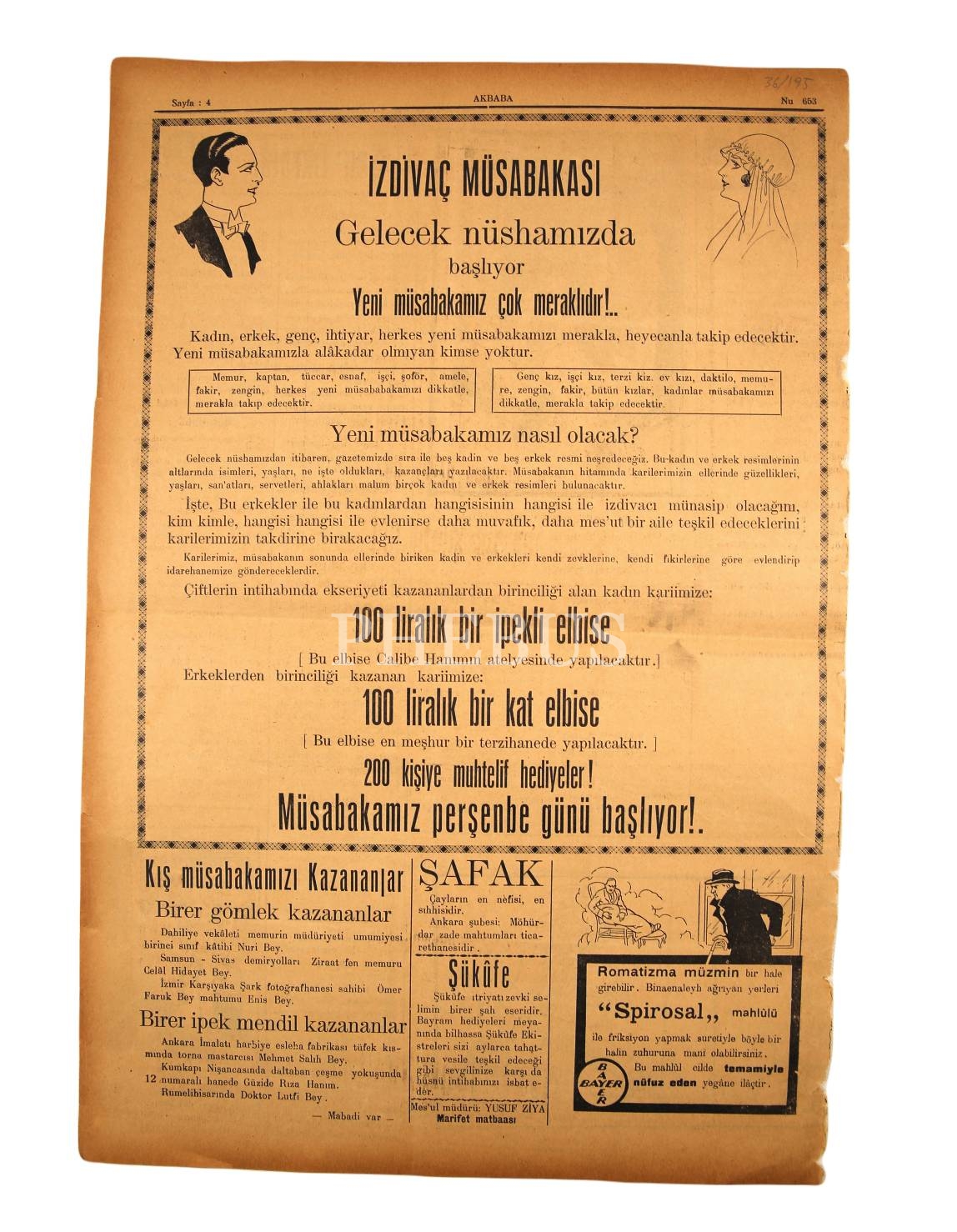 Arka kapak yazısı: "İzdivaç Müsabakası gelecek nüshamızda başlıyor" *Türkiye'nin en uzun ömürlü mizah dergilerinden olan Akbaba, 1922 yılında Yusuf Ziya Ortaç ve Orhan Seyfi Orhon tarafından kurulmuş ve kesintilerle birlikte 1977'ye kadar yayın hayatını sürdürmüştür. Zaman içerisinde de toplumun yoksul kesiminin dergisi olarak geniş bir okuyucu kitlesine ulaşmıştır.