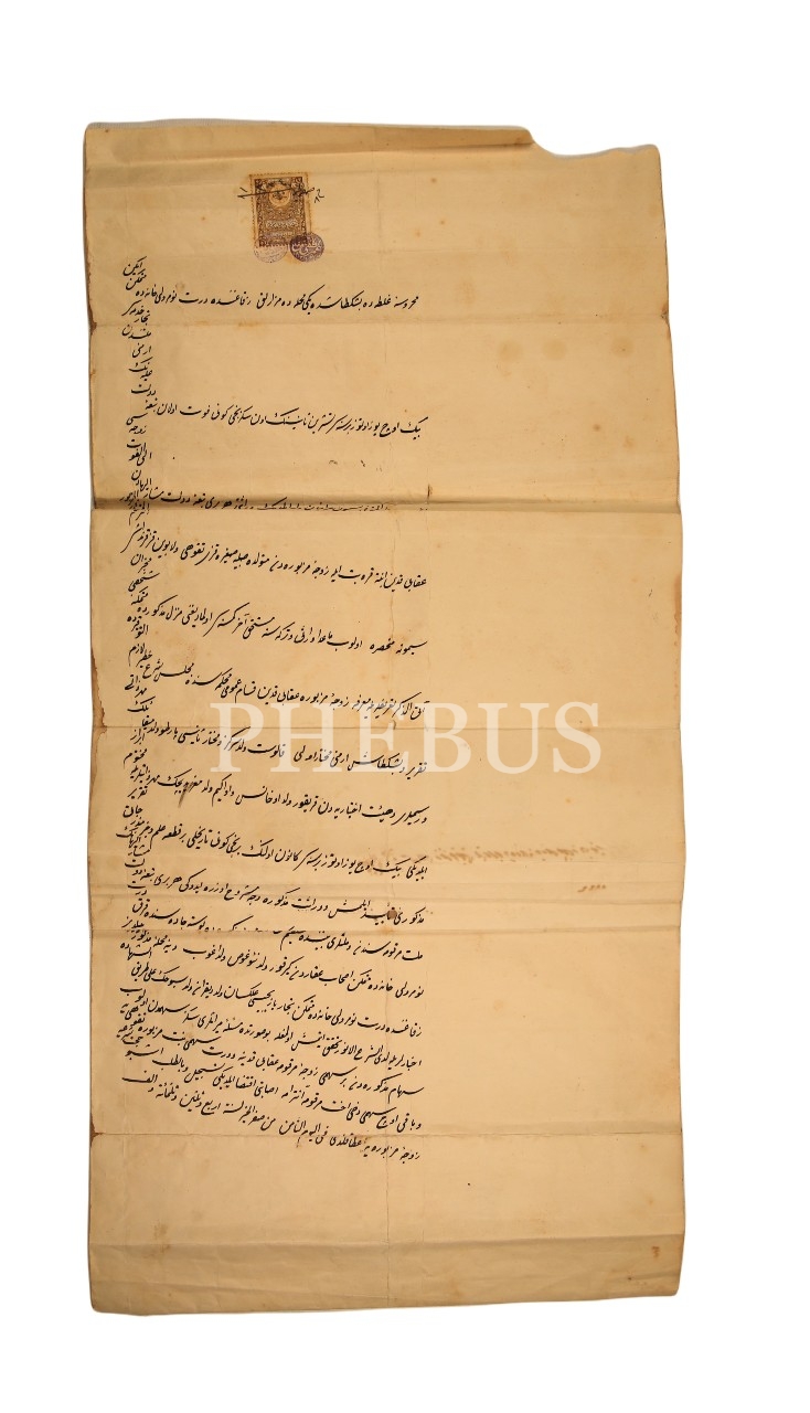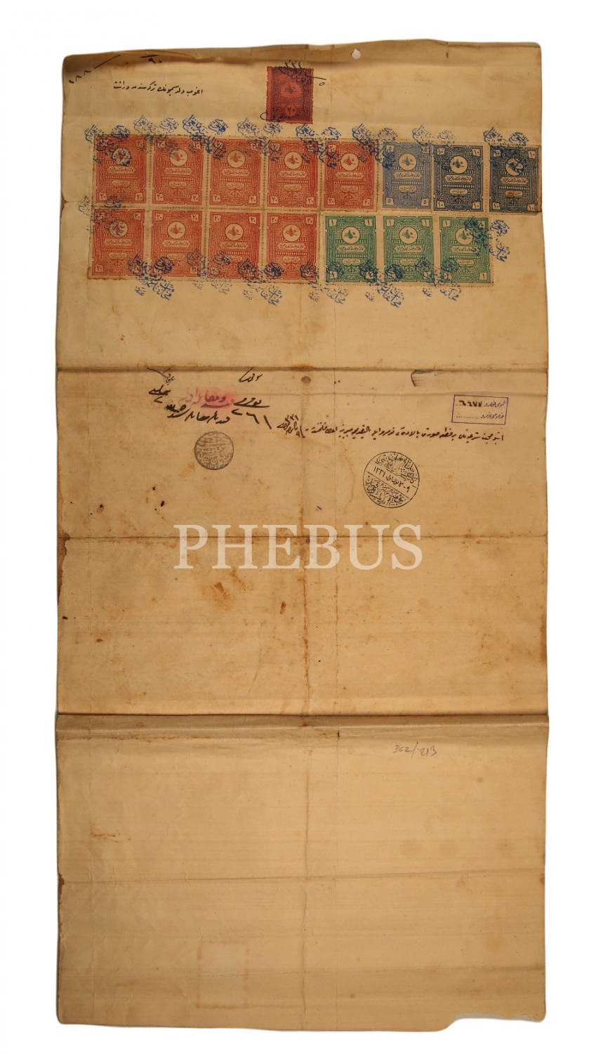 Vefat eden Ermeni bir Osmanlı vatandaşının mirasının paylaşımına dair Osmanlıca hüccet, Beşiktaş/İstanbul, 1334 tarihli, 28x60 cm, üst kenardan kopuk ve kırışık haliyle