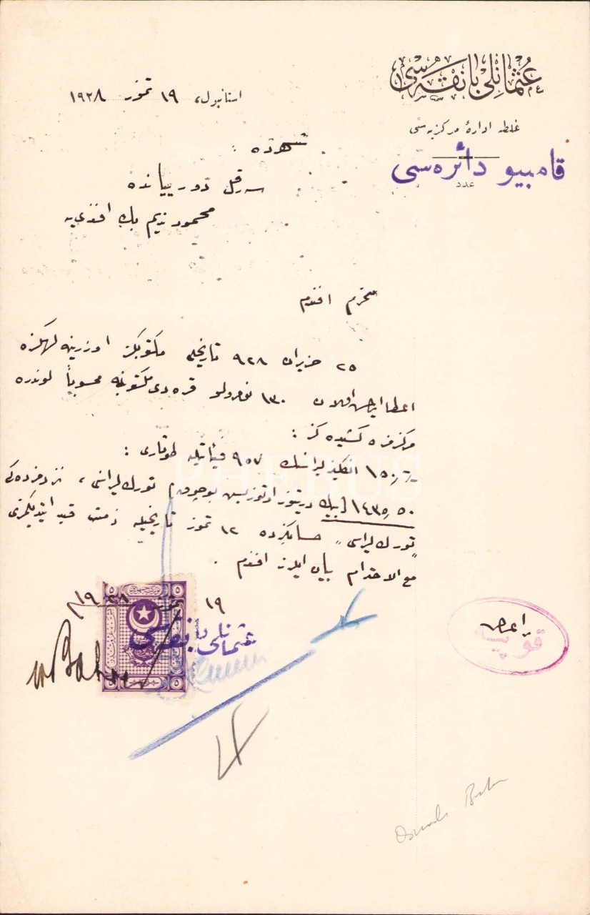 Osmanlı Bankası antetli bilgilendirme mektubu, 1928 tarihli, 16x24 cm